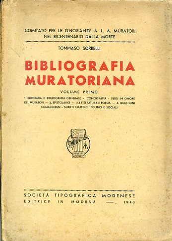 Bibliografia muratoriana. Volume primo: 1. Biografia e bibliografia generale. Iconografia. Versi in onore del Muratori. 2. Epistolario. 3. Letteratura e poesia. 4 Questioni comacchiesi. Scritti giuridici, politici e sociali