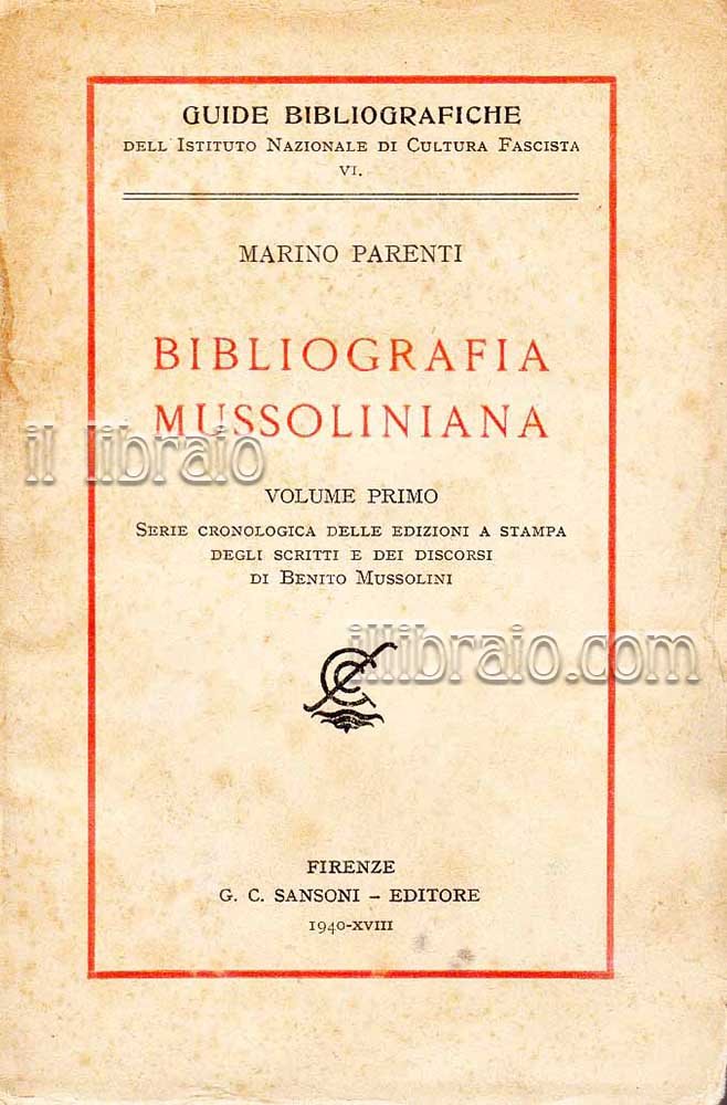 in 16°; pp. 288; br. Serie cronologica delle edizioni a stampa degli scritti e dei discorsi di B. Mussolini; coll. Guide bibliografiche. Primo vol. (ma unico pubblicato). (copertina sciupata; interno buono)