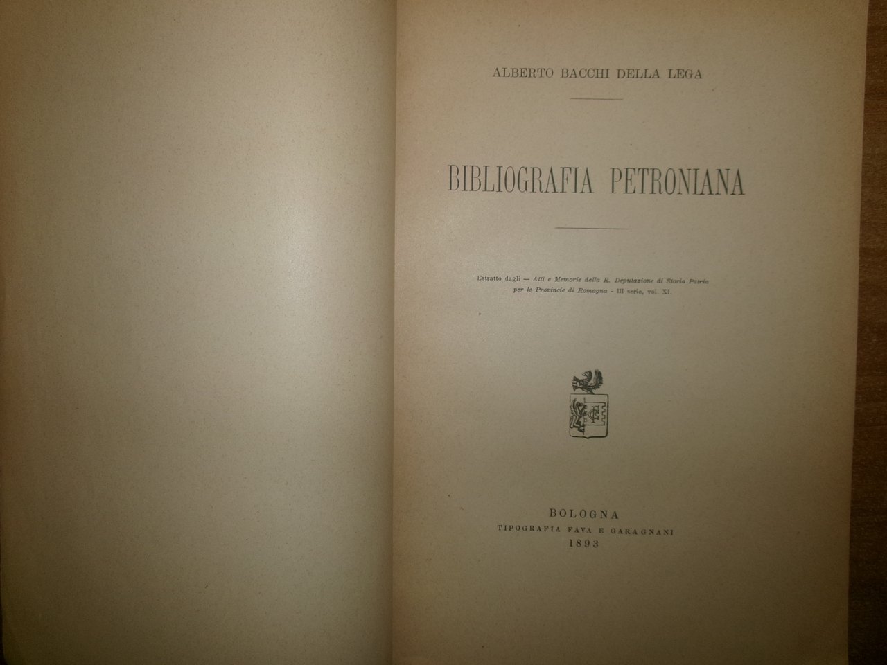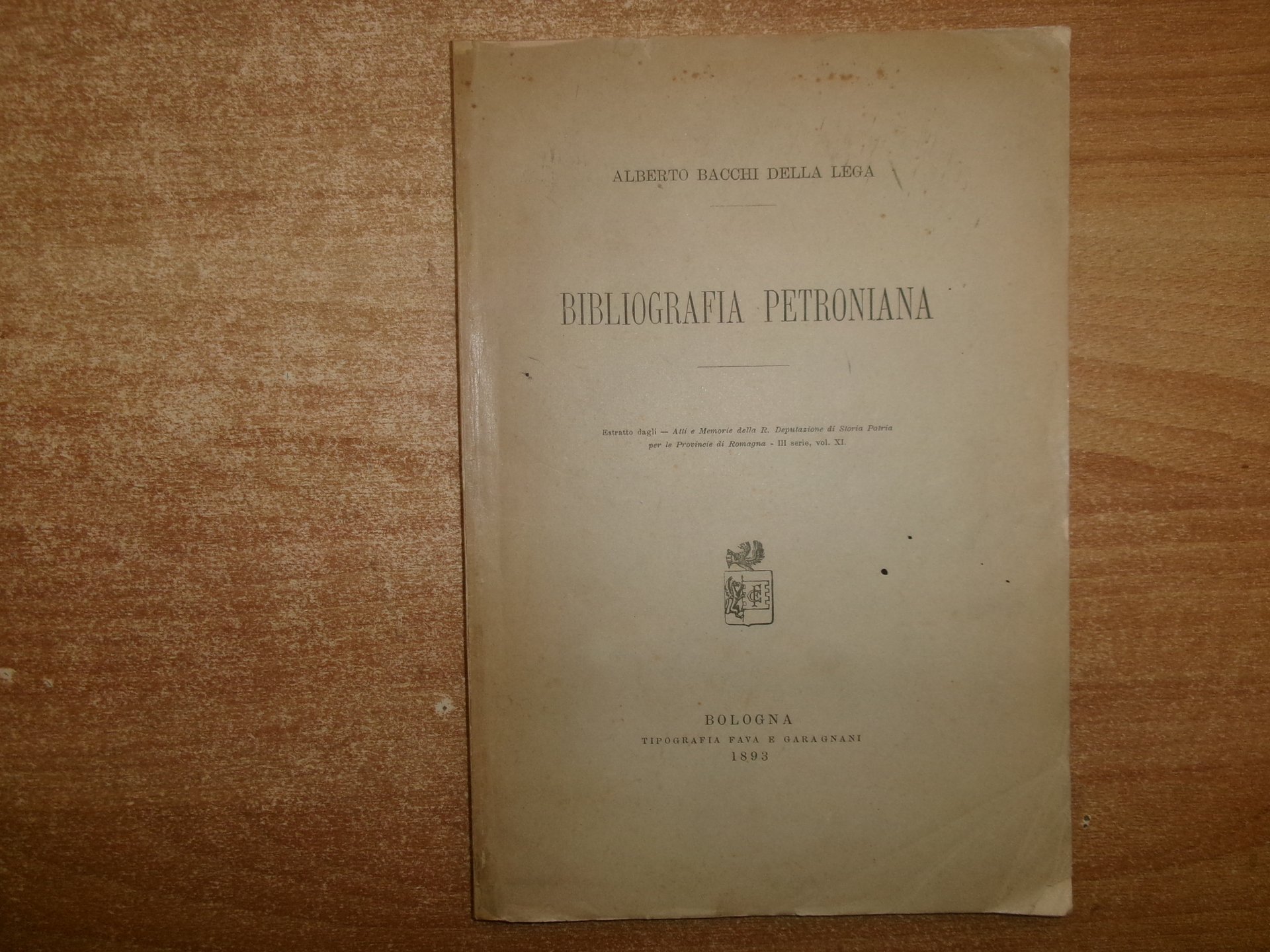 Alberto Bacchi Della Lega. Bologna, Tipografia Fava e Garagnani, 1893. BIBLIOGRAFIA PETRONIANA. Estratto dagli - Atti e Memorie della R. Deputazione di Storia Patria per le Provincie di Romagna - III serie, vol. XI. In-8°, br. orig. 54 pp. Raro. Neg. fot. mob. N entro busta trasp.