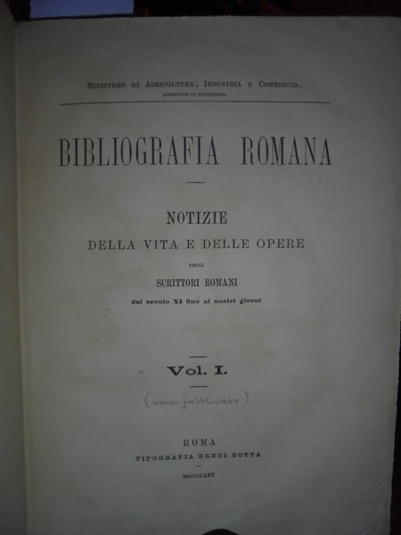 BIBLIOGRAFIA Romana. Notizie della vita e delle Opere degli scrittori romani dal Secolo XI fino ai nostri giorni. Vol. 1 (unico pubblicato).