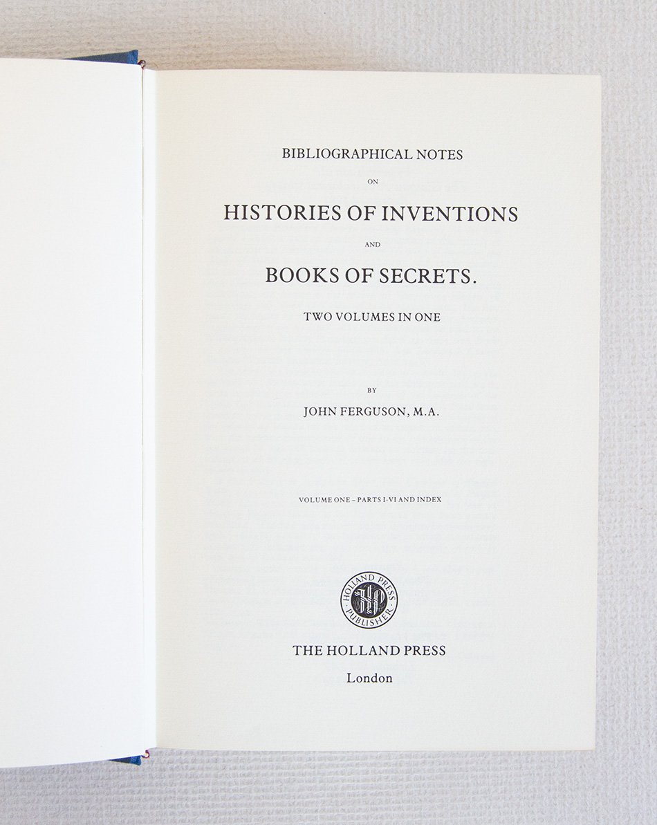 Dalla descrizione dell'editore: "[Ferguson] descrive centinaia di libri, dal XV al XVIII secolo, di ricette tecniche, medicina popolare, cucina e libri di segreti, sia inglesi che stranieri, per lo più di notevole rarità, fornendo collazioni esatte e note ampie." L'opera rappresenta anche una ricca fonte di informazioni sull'alchimia.