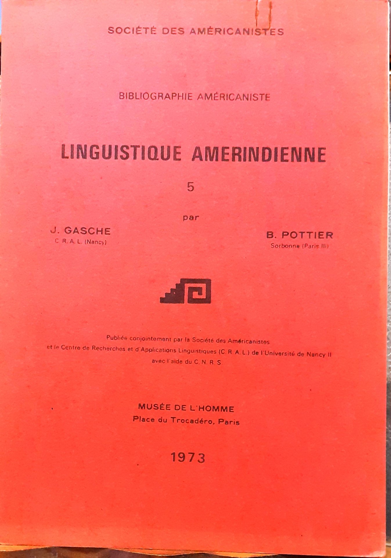 BIBLIOGRAPHIE AMERICANISTE: LINGUISTIQUE AMERINDIENNE 5, publiée conjointement par la Société des Américanistes et le Centre de Recherches et d'Applications Linguistiques (C.R.A.L.) de l'Université de Nancy II avec l'aide du C.N.R.S.