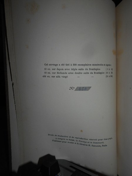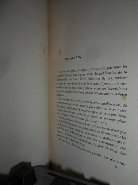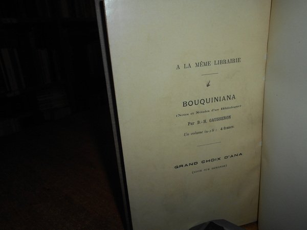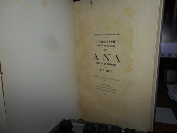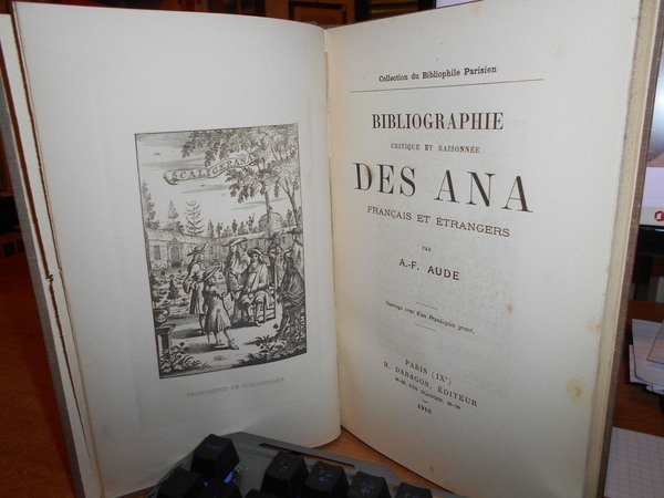 AUDE A. F. Paris, (IX) H. Daragon éditeur, 1910. BIBLIOGRAPHIE CRITIQUE ET RAISONNÉE DES ANA FRANÇAIS ET ÉTRANGERS. In-8°, tela con fregi e titolo in oro al dorso, brossure originali conservate. xv, 122 pp. Ouvrage orné d' un Frontespice gravé. Tiratura limitata di 500 esemplari numerati (es. n° 450). Ottimo esemplare in legatura artigianale con le copertine originali conservate. Uff. E - II - 1
