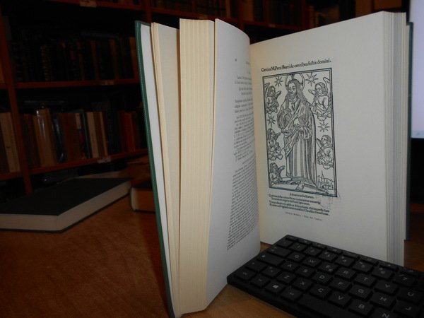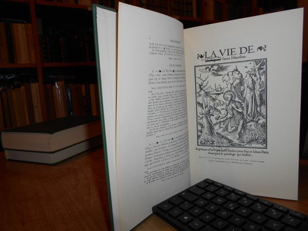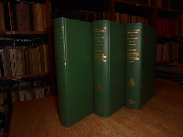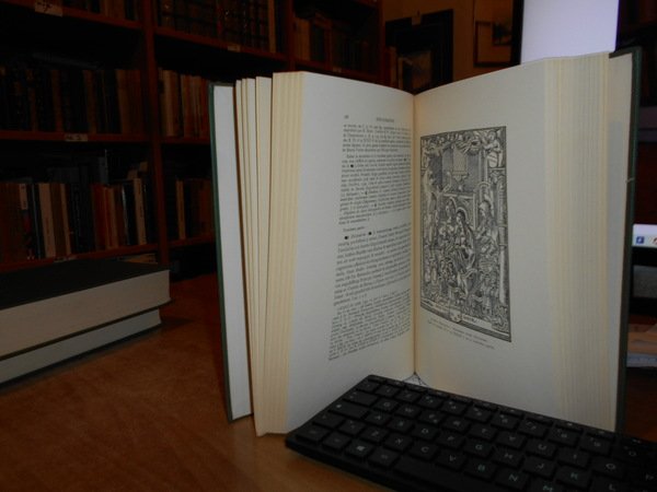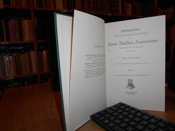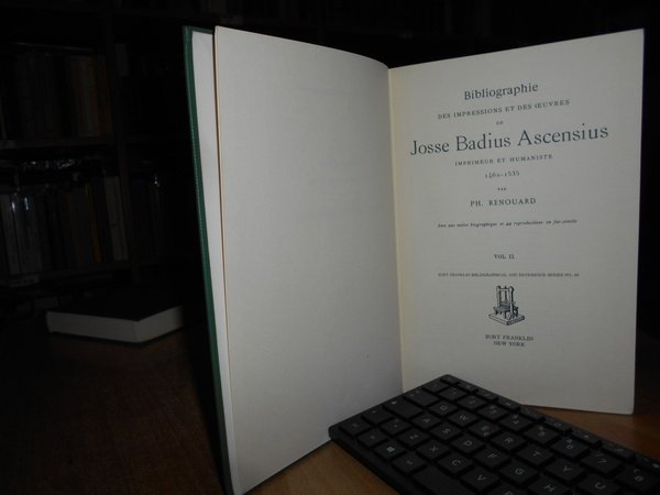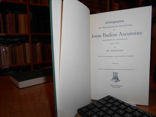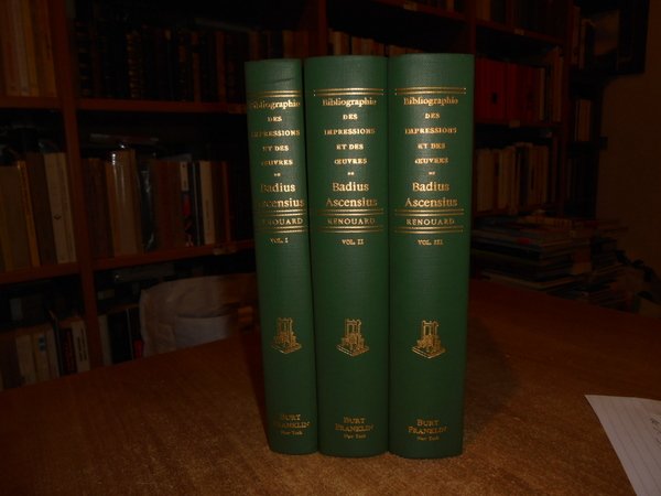 Renouard. New York, Burt Franklin, 1967. BIBLIOGRAPHIE des Impressions et des Oeuvres de JOSSE BADIUS ASCENSIUS Imprimeur et Humaniste 1462-1535. Avec une notice biographique con 44 riproduzioni in fac-simile. 3 volumi in-8°, tela verde edit. con titoli in oro ai dorsi. viii, 323, (3) pp.; 548 pp.; 529 pp. Perfetto esemplare. Uff. E - I - 5 - 2