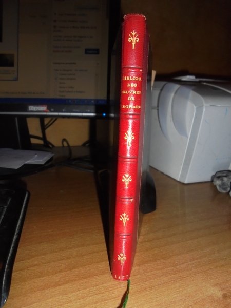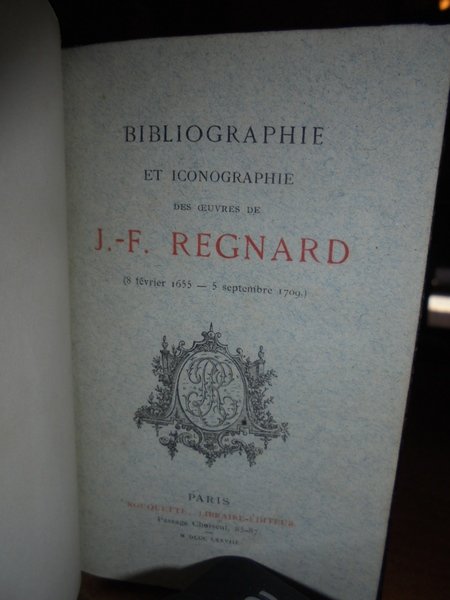 BIBLIOGRAPHIE et Iconographie des Oeuvres de J.-F. REGNARD (8 février 1655 - 5 septembre 1709). Paris, Rouquette, 1878. In-12° (14 x 9 cm.), m. pelle rossa con nervetti, fregi e titolo in oro al dorso, copertine originali conservate. 66 pp. In legatura di pregio. Uff. A - I - 1 - 2