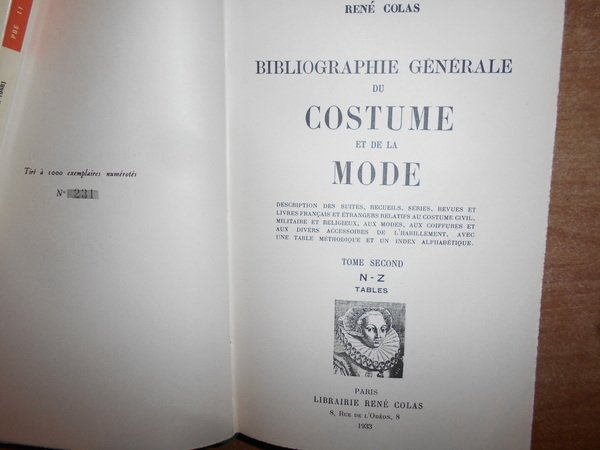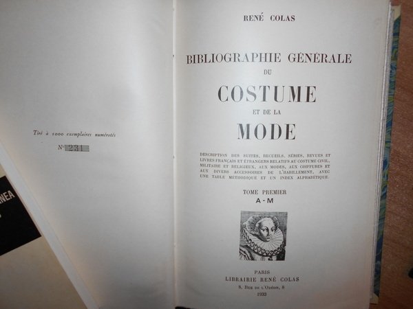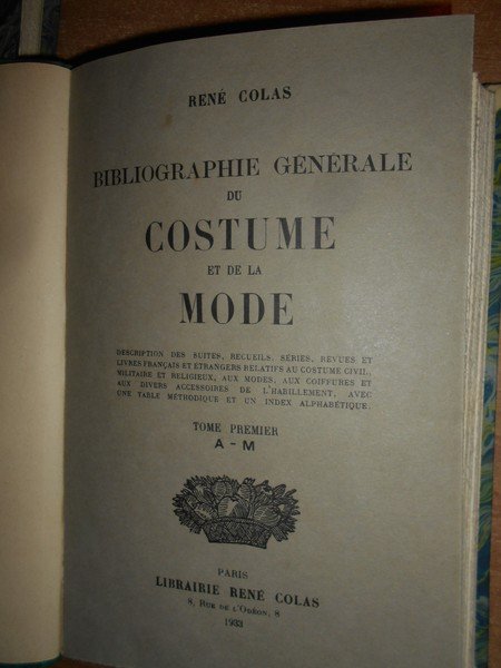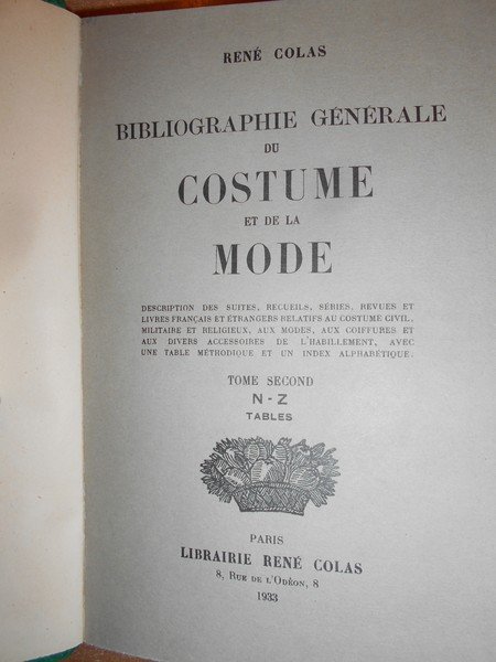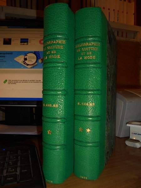 PARIS, Librairie René, Colas, 1933. BIBLIOGRAPHIE Générale du COSTUME et de la MODE. 2 volumi in-8°, m. marocchino verde smeraldo, dorso a 5 nervi, copertine originali conservate. VIII,1411pp. (unica numerazione per i due voll.), 69 pp. con alcune illustrazioni nel testo. Bellissimo esemplare in legatura di pregio in m. marocchino verde smeraldo con barbe. Le copertine originali sono conservate. Tiré à 1000 exemplaires numérotés n° 231. Uff. E - II - 5