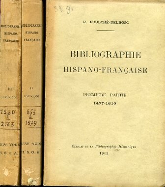 3 voll. in16°, pp. (4), 254; (4), 218; (4), 227; brossura editoriale. Ampio indice in fine del terzo vol. Bell'esemplare. Prima edizione in volume, rara, estratta dalla 'Bibliographie Hispanique', di questa preziosa bibliografia che il grande ispanista redasse delle opere in lingua francese dedicate alla Spagna, dalle origini della stampa al 1700. L'opera è stata ristampata in forma anastatica nel 1962, a mezzo secolo dalla sua apparizione.