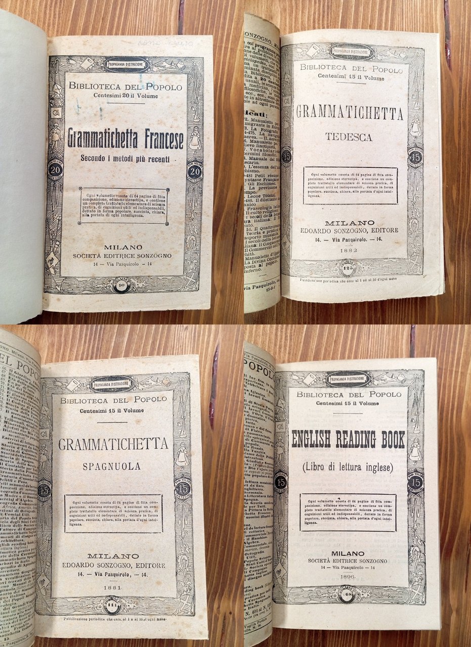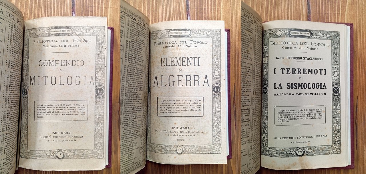 Volume cartonato che rilega undici (11) fascicoli della Biblioteca del Popolo edita da Sonzogno negli ultimi decenni dell'Ottocento. I testi sono i seguenti: 1) Grammatichetta francese secondo i metodi più recenti, senza data, pp. 64 - 2) Grammatichetta tedesca, 1882, pp. 64 - 3) Grammatichetta spagnuola, 1881, pp. 64 - 4) English reading book (Libro di lettura inglese), 1896, pp. 64 - 5) Petit manuel del Lecture Française, 1879, pp. 64 - 6) Luigi Pedrotti, Risoluzione delle equazioni di 1° e 2° grado, senza data, pp. 64 - 7) Ricettario domestico, 1910, pp. 64 - 8) Meteorologia, 1881, pp. 64 - 9) Compendio di mitologia, senza data, pp. 64, restauro al frontespizio - 10) Elementi di algebra, 1896, pp. 64 - 11) Ottorino Stacchiotti, I terremoti e la sismologia all'alba del secolo XX, senza data, pp. 64, illustrazioni in bianco e nero. Raccolta ben conservata.