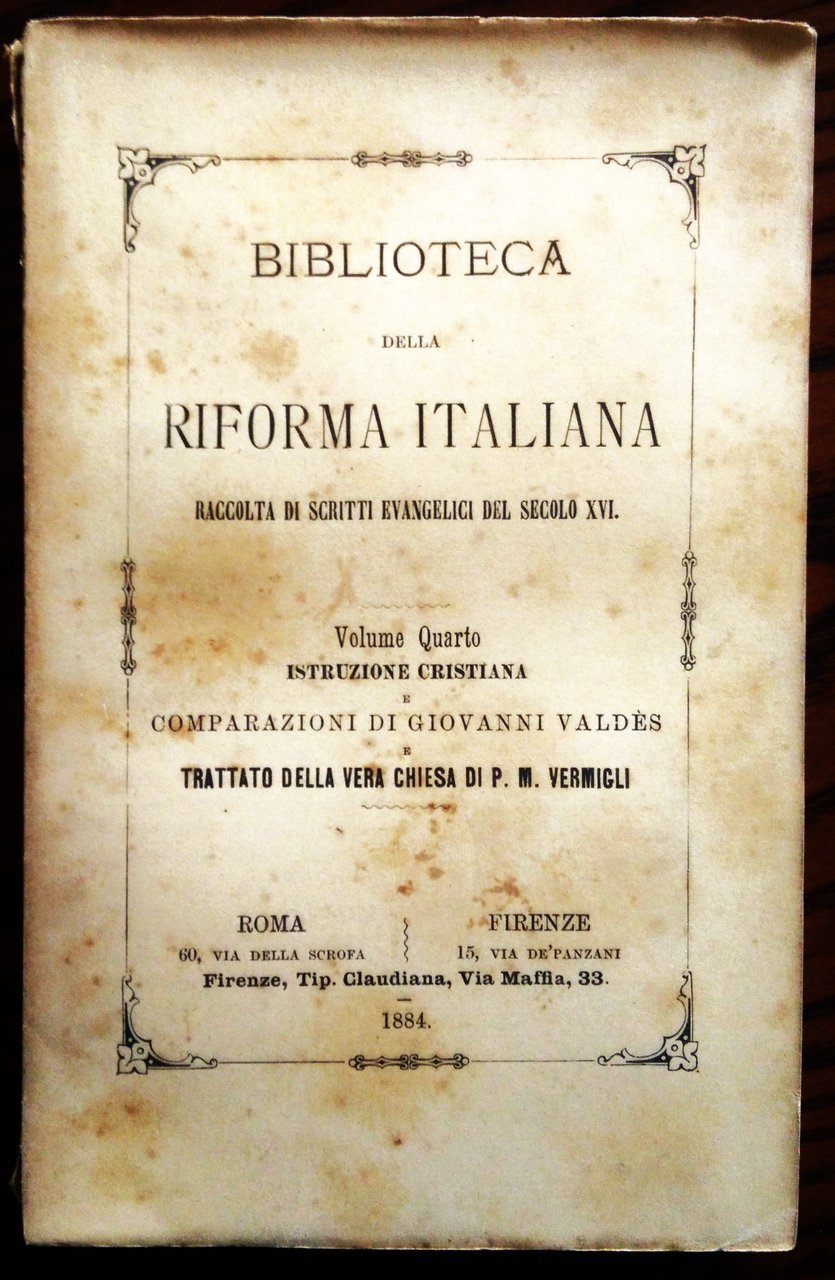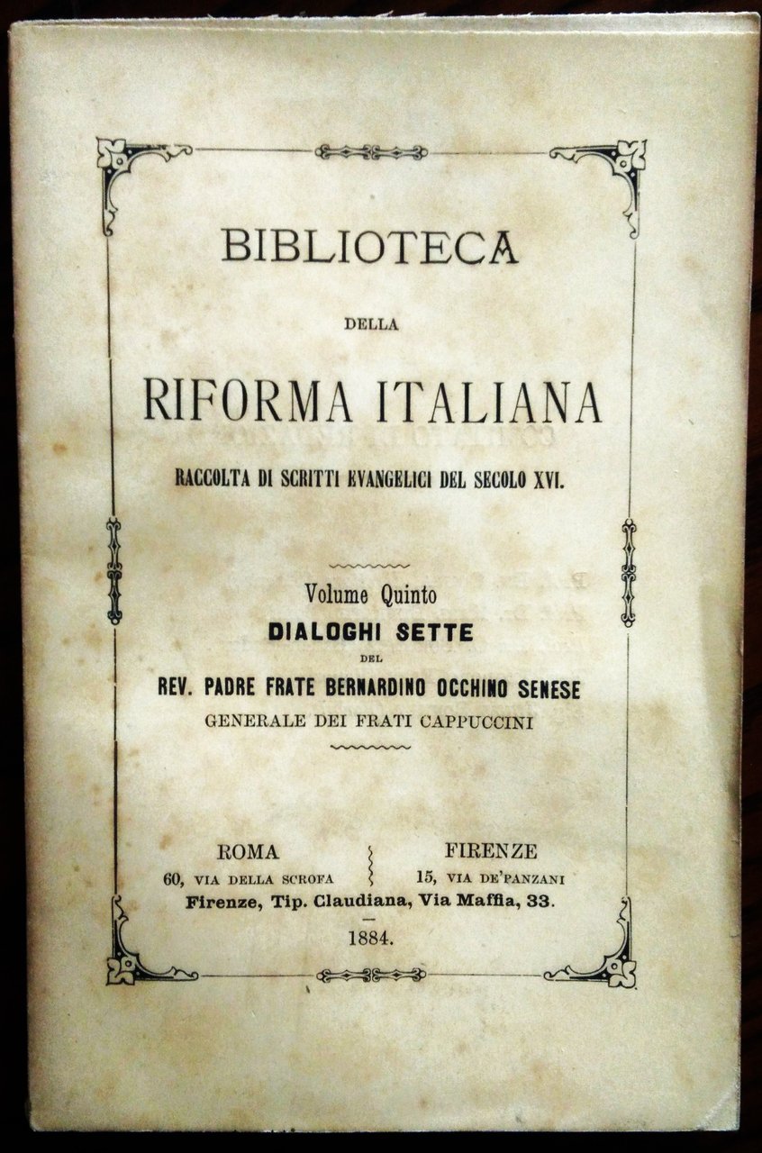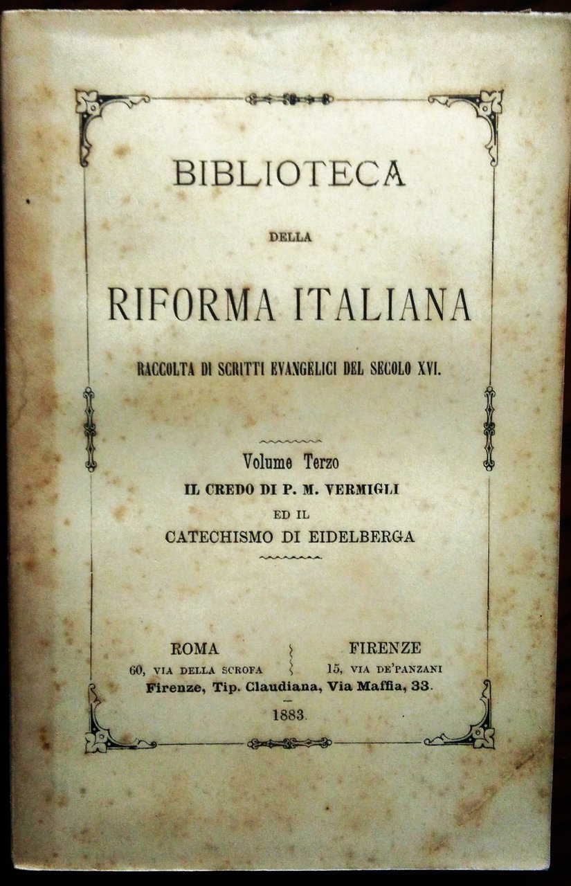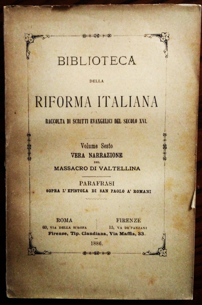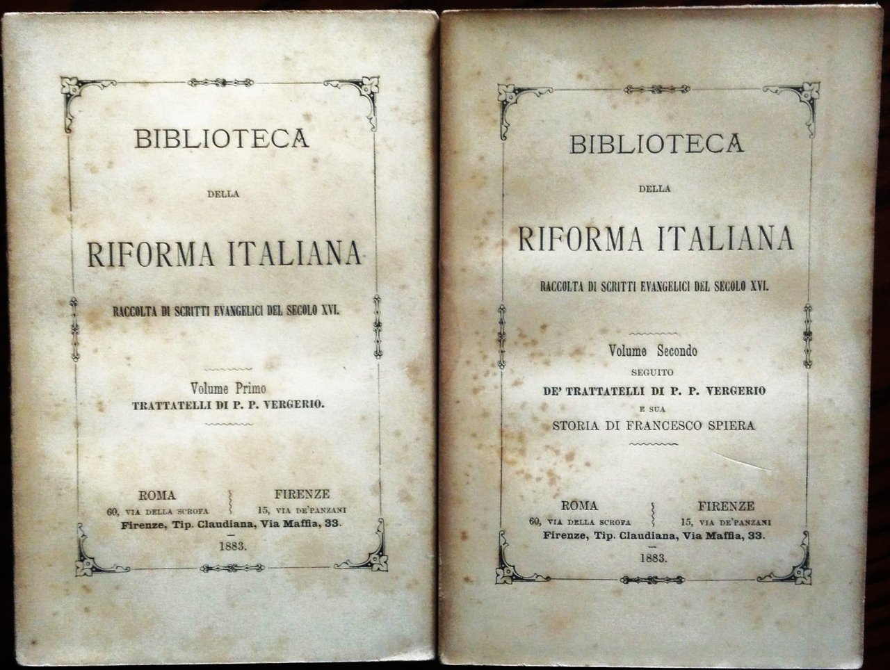 Firenze, Tip. Claudiana 1883-86. 16°, sei volumi, pp. . VIII - 106, 124, 136, 164, 96, 156, brossure editoriali. Trattatelli di P. P. Vergerio; Storia di Francesco Spiera; Il Credo di P. M. Vermigli ed il Catechismo di Eidelberga; Istruzione cristiana e Comparazioni di Giovanni Valdes e Trattato della vera Chiesa di P. M. Vermigli; Dialoghi sette del rev. padre frate Bernardino Occhino senese generale dei frati Cappuccini; Vera narrazione del massacro di Valtellina. Parafrasi sopra l'Epistola di San Paolo a' Romani. Copertina anteriore del sesto volume staccata, quella del quarto parzialmente, segni d'uso ai dorsi.