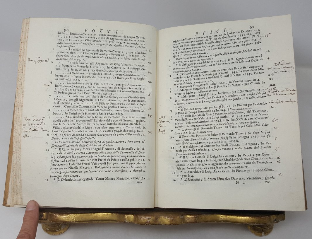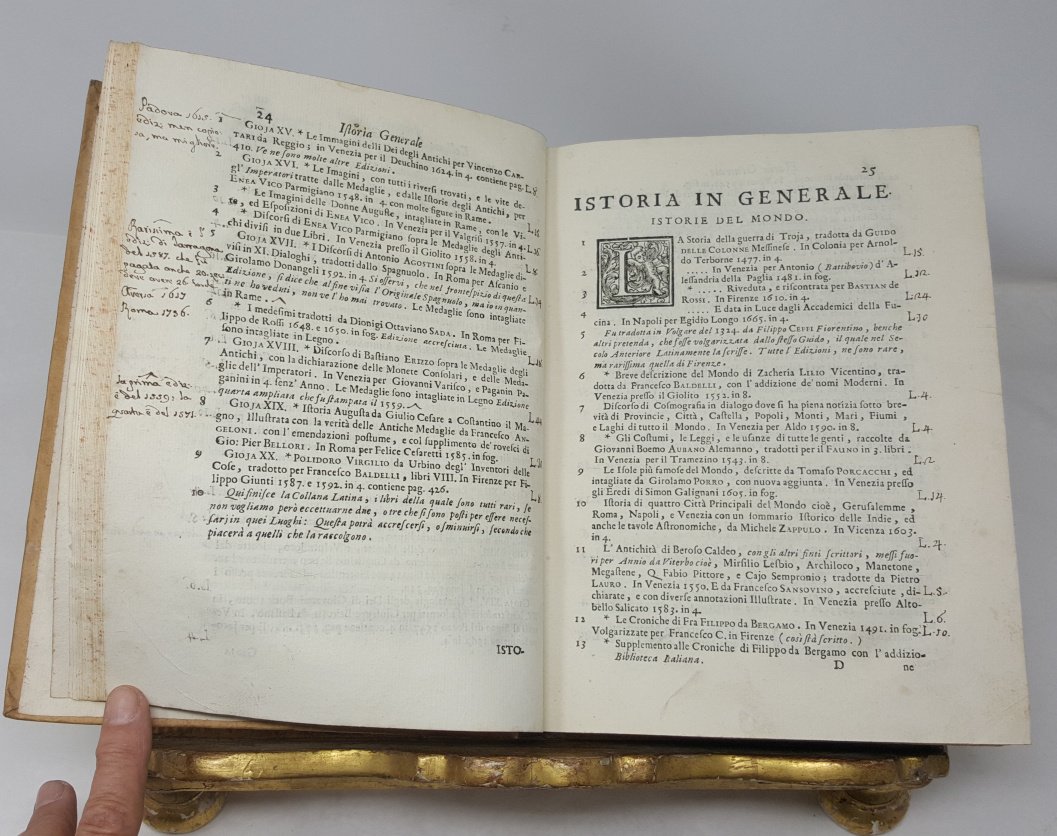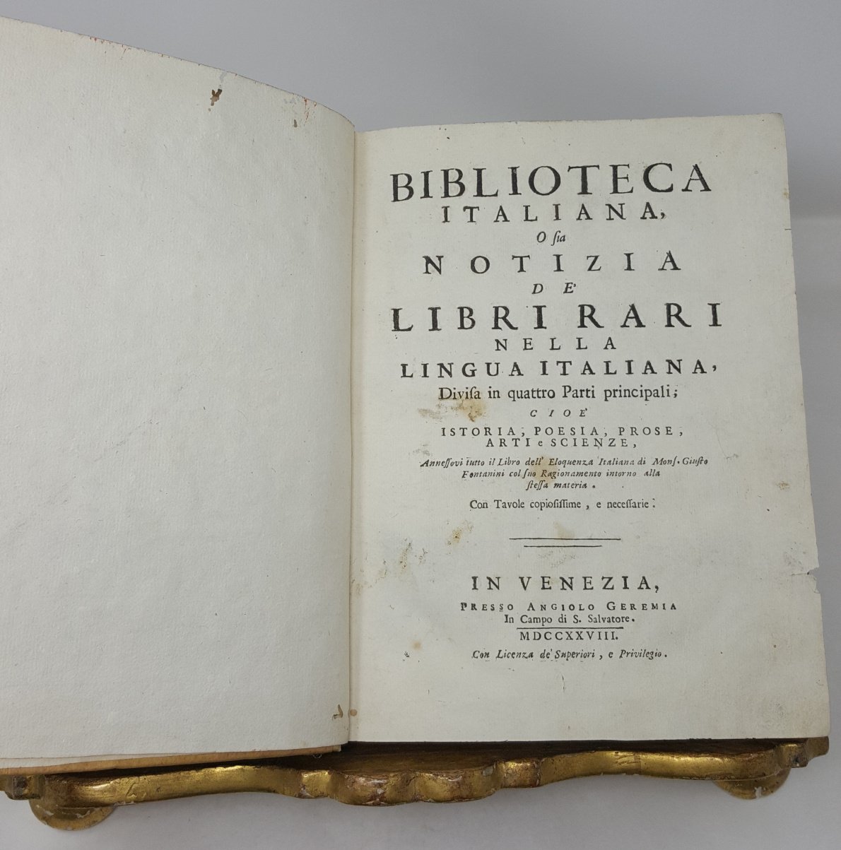 >in-4, pp. (24), 264, capilettera figurati e finalini, legatura coeva in cartonato, titolo in oro su tassello al dorso. Il nome dell'autore si ricava dall'epistola ai lettori. Seconda edizione, la prima apparve a Londra nel 1726 in un solo volume, come la presente. Rara bibliografia di testi letterari e storici italiani, tra le prime in materia, che elenca e descrive succintamente migliaia di edizioni pubblicate dal ‘400 al primo ‘700 di autori italiani o di alcuni testi stranieri tradotti nella nostra lingua. Bell'esemplare, appartenuto a profondo studioso dell'epoca: annotato e corretto nei margini e soprattutto con i prezzi, o valutazioni, di ogni singola opera, espressi in lire; di gran lunga le più care risultano le due Bibbie del Malermi. Graesse III, 222; Brunet III, 65