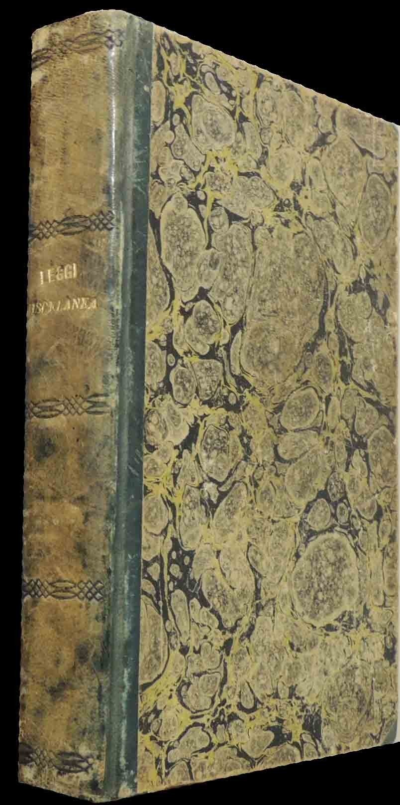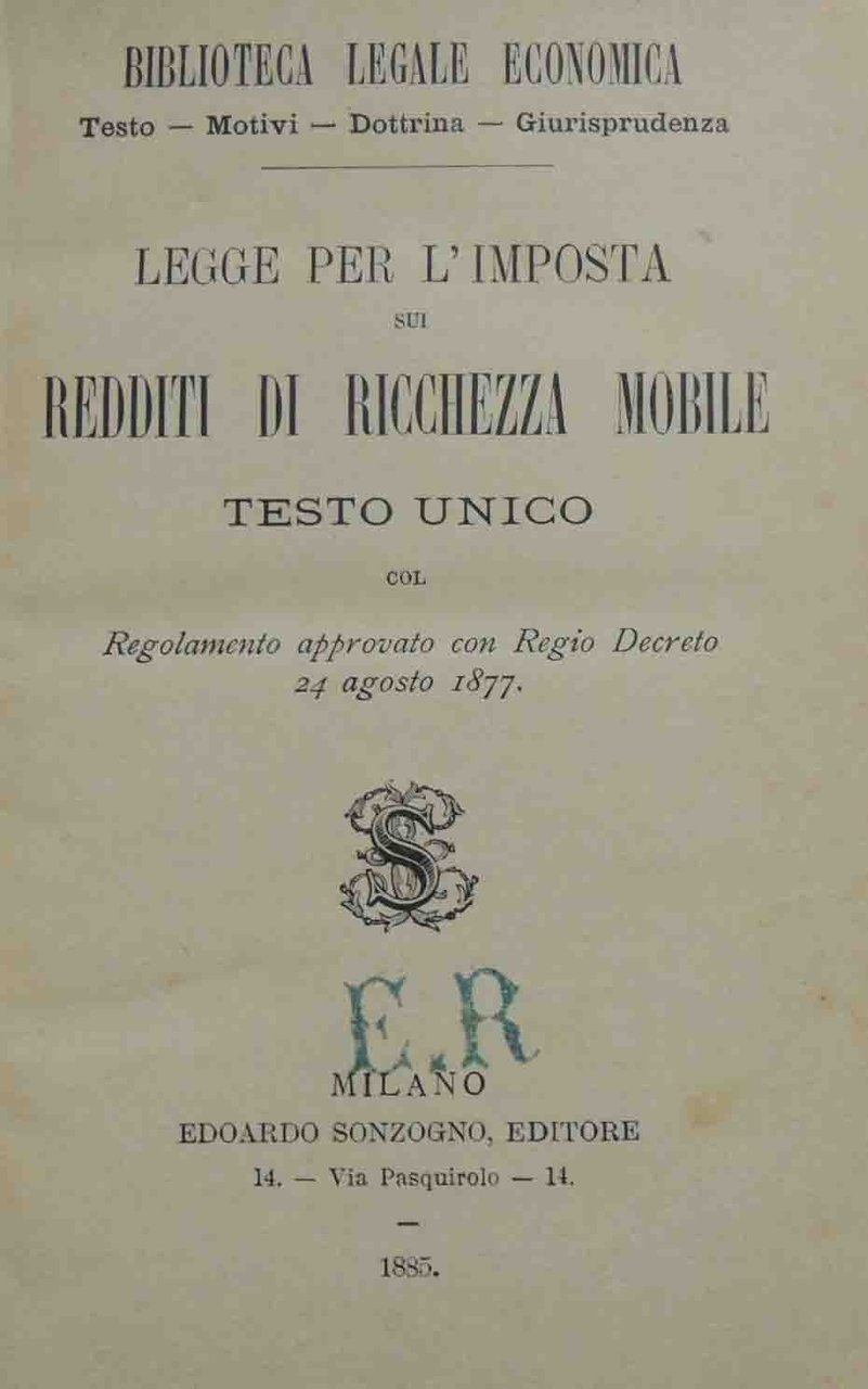 Legge per l’imposta sui redditi di ricchezza mobile. Testo unico. Col Regolamento approvato con Regio Decreto 24 agosto 1877, Edoardo Sonzogno Editore, Milano 1885, pp. 99, cm 18, elegante legatura coeva in mezza pelle verde con angoli in tela, titoli in oro e fregi a impressione al dorso e piatti in carta marmorizzata. Legato con: Leggi, regolamento, istruzioni sui dazi di consumo. Con brevi illustrazioni, Edoardo Sonzogno Editore, Milano 1885, pp. 134. Legato con: Legge sui lavori pubblici (20 marzo 1865, n. 2248). Con illustrazioni, Edoardo Sonzogno Editore, Milano 1885, pp. 114. Legato con: Legge sulla pubblica sicurezza (Allegato B della Legge 20 marzo 1865, n. 2248). Colle successive modificazioni, brevemente annotata e susseguita dal regolamento e da disposizioni relative al domicilio coatto, Edoardo Sonzogno Editore, Milano 1885, pp. 122. In testa a ciscuno frontespizio: Biblioteca Legale Economica. Testo, motivi, dottrina, giurisprudenza. Piccolo timbro di appartenenza al frontespizio e su qualche carta di testo della prima legge. Piccole annotazioni e segnetti di lapis a margine della prima legge, una piccola annotazione a china al primo occhiello, minime abrasioni alla legatura, per il resto volume fresco e pulito, integro, ben conservato e solidamente legato. Raro insieme, con alla carta di guardia anteriore indice manoscritto del contenuto del volume.