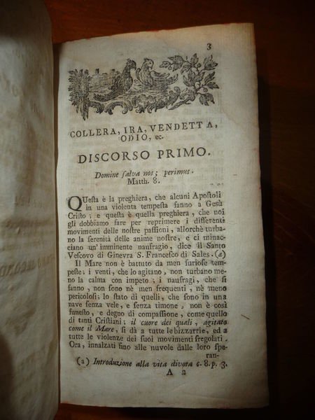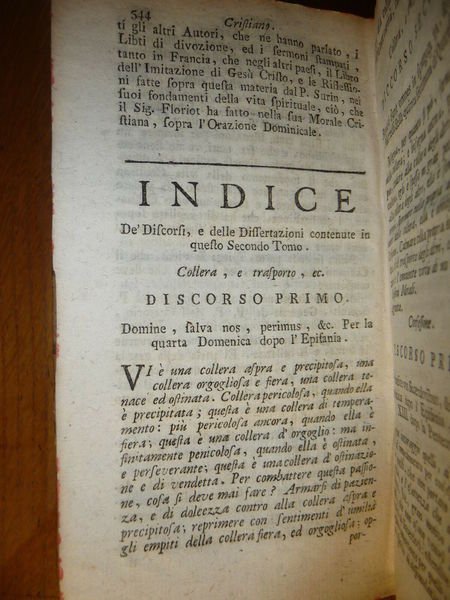 TITOLO: BIBLIOTECA PREDICABILE E SCIENZA UNIVERSALE DEL PULPITO OVVERO DIZIONARIO MORALE IN CUI TROVASI IN ORDINE ALFABETICO, TUTTO CIO' CHE I PADRI GRECI E LATINI, GL'INTERPRETI DELLA SACRA SCRITTURA, I TEOLOGI ED I PREDICATORI, ECC. Vol. II DESCRIZIONE: Stamperia Baglioni Venezia 1800 rilegatura d'epoca in mezza pelle, tit. a penna al tassello. pp. 552 in 16°. CONDIZIONI: Ottime, solida legatura, titolo al tassello, tagli virati in rosso. Opera in tre tomi completi di prediche per Teologi ed agli amatori e studiosi della scienza Concionatoria, di cui disponibile solo il secondo. PESO / WEIGHT: 294 gr. without package