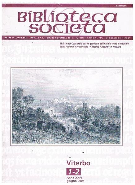 Biblioteca società, rivista del consorzio per la gestione delle bibloteche comunale degli ardenti. N° 1-4 in due fasc. Uno sconosciuto monumento rupestre presso Ferento; Tituli epigrafici e antropomini longobardi a Bagnoregio; contratti dotali a Nepi; una grandiosa opera di drenaggio etrusca; ecc.