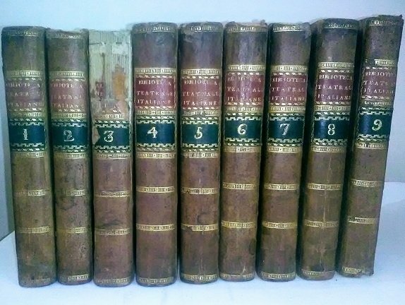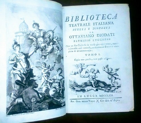 In-8, nove volumi su dodici .In Lucca, per Gio. Della Valle, 1762-1764 Rara raccolta settecentesca di opere teatrali a cura di Ottaviano Diodati, tra cui quelle di Goldoni, Mestasio, Salvi, Nivelle de La Chaussé e Diodati stesso, noto esponente dell'illuminismo italiano. In apertura del volume I e prima di ogni opera teatrale, antiporte calcografiche disegnate da Domenico Paladini, incise da Ferdinando Fambrini e Giovanni Canocchi. Ai frontespizi emblema calcografico (3 amorini con libri) disegnato e inciso da Canocchi. Legature coeve in piena pelle, al dorso titolo e numero del volume in oro su tasselli rossi e verdi, nervi disegnati in oro. I volumi sono impreziositi dagli ex libris di una famiglia principesca italiana. Imbrunimento della carta, mancanza di quattro cm al dorso del tomo 3, angoli arrotondati, foxy, percorso di tarlo al tomo 9, qualche segno da sfregamento. In-8, nine volumes of twelve. In Lucca, for Gio. Della Valle, 1762-1764 Rare eighteenth-century collection of theatrical works by Ottaviano Diodati, a well-known exponent of the Italian Enlightenment. At the opening of volume I and before each theatrical work, chalcographic anti-doors designed by Domenico Paladini, engraved by Ferdinando Fambrini and Giovanni Canocchi. On the title pages, a chalcographic emblem (3 cupids with books) designed and engraved by Canocchi. Contemporary full leather binding, title and volume number on the spine in gold on red and green labels, bands designed in gold. The volumes are embellished with the bookplates of an Italian princely family. Browning of the paper, lack of 4 cm in the spine of tome 3, rounded corners, foxy, path of woodworm in tome 9, some rubbing marks.