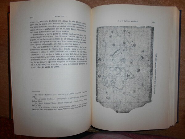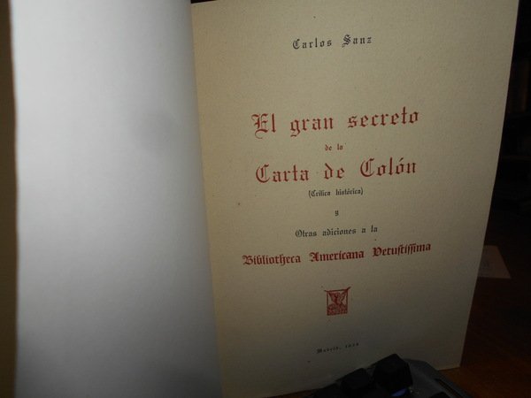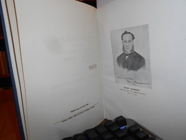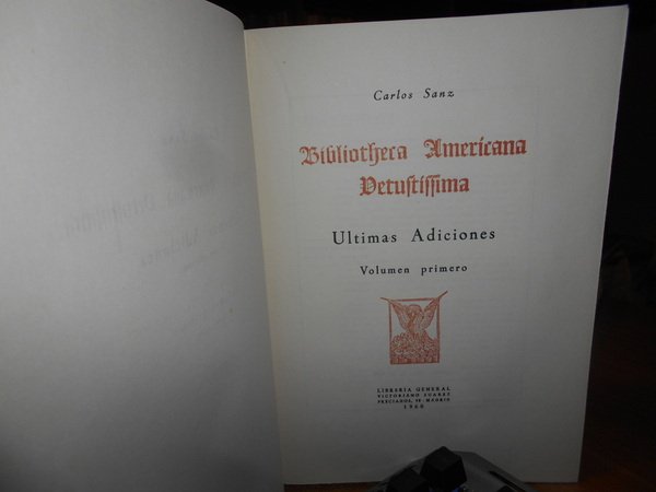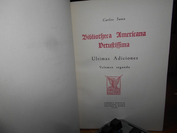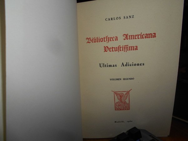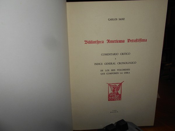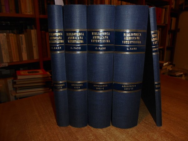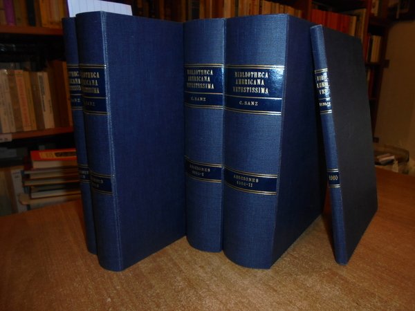 CARLOS SANZ. Madrid, Libreria General Victoriano Suarez, 1958/1960. BIBLIOTHECA AMERICANA VETUSTISSIMA. 5 volumi in-8° grande, tela bleu con titoli in oro entro tasselli ai dorsi, tutte le copertine originali conservate. Vol. I. HENRY HARRISSE (1828 - 1910). Su Vida - Su Obra. 282, (3) pp. con un ritratto in antiporta f.t. Vol. II. El Gran secreto de la Carta de Colon. 523, (2) pp. Vol. III. Ultimas Adiciones (en dos volumes). 629 pp. Vol. IV. da p. 630 a 1407, (6) pp. in tutti numerosi facsimili nel testo. Vol. V. Comentario critico e indice general cronologico. 79 pp. Ottimo esemplare (completo). Vendibile solo in Italia. Uff. B - II - 6.