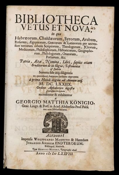 Bibliotheca Vetus et Nova, in qua Hebraeorum, Chaldaeorum, Syrorum, Arabum, Persarum, Aegyptiorum, Graecorum & Latinorum per Universum terrarum orbem Scriptorum, Theologorum, JCtorum, Medicorum. Philosophorum, Historicorum, Geographorum, Philologorum