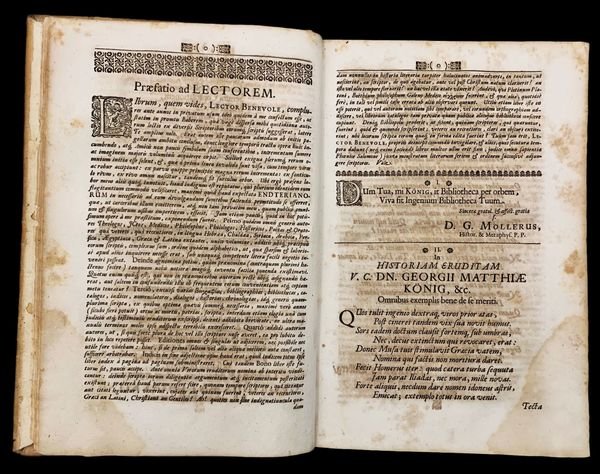 In folio (28x18,5 cm); (10), 888 pp. Bella legatura coeva in piena pergamena con titolo manoscritto da abile mano coeva al dorso in chiara grafia. Leggero foxing ed alcuni fogli leggermente bruniti (marcatamente brunita lultima carta che presenta uno stratto in corrispondenza di una piega, senza però perdita di carta). Nel complesso esemplare in buone condizioni di conservazione. A causa della qualità della carta utilizzata e tipico di tutti gli esemplari. Prima edizione di questa celebre opera del noto storico, biografo e professore tedesco, Georg Matthias König (1616-1699). Professore di poesia e lingua greca all'Università di Altdorf, fu anche, a lungo, bibliotecario della grande delluniversità cittadina. Lopera qui presentata è la sua più celebre ed è considerata come uno dei primissimi tentativi di costruire una bibliografia generale mondiale con citazioni di opere latine, greche, ebraiche, arabe, siriane, caldaiche ed egizie. Essa rappresenta un notevole tentativo di creare una bibliografia universale con lo scopo chiaro di migliorare la Bibliotheca Universalis di Gesner. Il volume contiene circa 35.000 titoli, di circa 15.000 autori disposti in ordine alfabetico, con numerose citazioni bibliografiche e annotazioni che si riferiscono a varie precedenti opere storiche e letterarie. La sua Bibliotheca, come osserva James Darling col.1749, è un "more useful book than many of greater pretensions". Ebert # 11497 osserva che "This lexicon of learned men, with all its faults, has matter peculiar to itself ". Petzholdt p.73 scrisse che un manoscritto contenente un tentativo di supplemento a König datato 1730 in 1003 colonne era stato trovato ad Amburgo ma non venne mai pubblicato. Firs edition, good copy. Rif. Bibl.: Besterman Besterman, The Beginnings of Systematic Bibliography, p.48 col # 804; Jocher col 2137; H.P. Catalogo Kraus 190; Catalogus Catalogorum, n. 525.