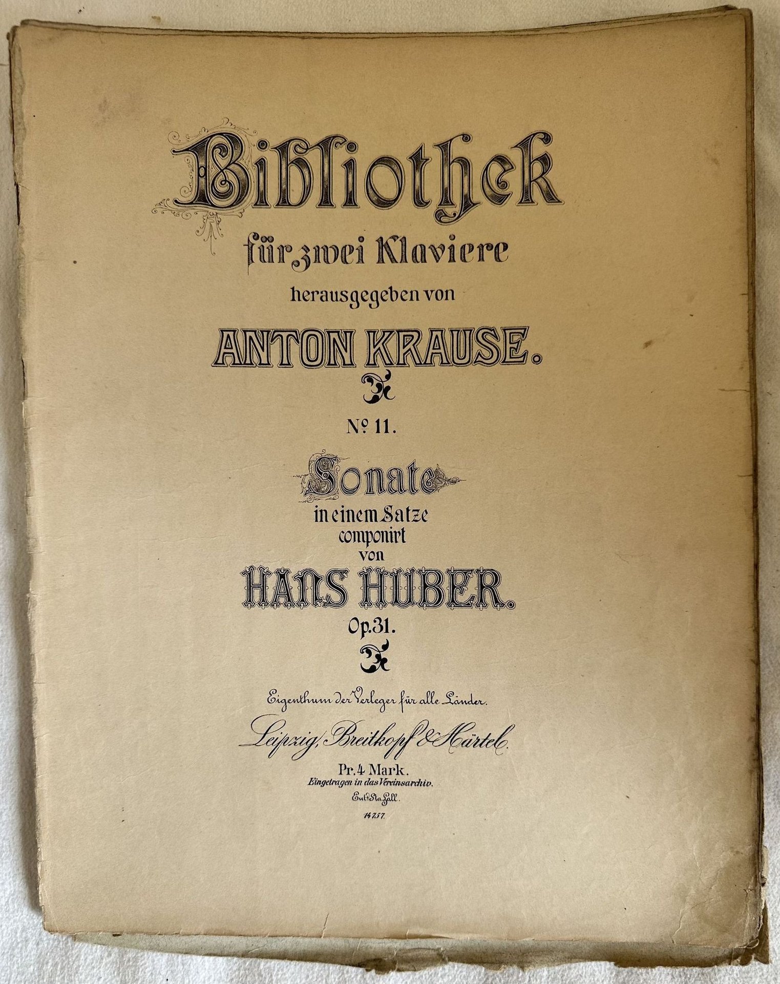 Edizione di inizio novecento della melodia per pianoforte "Sonate"dall'opera 31 del compositore svizzero Hans Huber (1852-1921). Partitura per doppio pianoforte della collana "Bibliothek fur zwei klaviere von Anton Krause" In discrete condizioni. Copertina editoriale in discrete condizioni con usure marginali. Legatura in buone condizioni. Prima pagina in parte staccata. Pagine in buone condizioni con fioriture. In Folio. cm. 34x27. Pp. 13, 11. Edition of early 20th century of this melody for piano "Sonate" from the opera 31" by the switzerland composer Hans Huber (1852-1921). Score for double piano of the series "Bibliothek fur zwei klaviere von Anton Krause". In fair conditions. Editorial cover in fair conditions lightly worn in the extremities. Binding in good conditions. First page partially detached. Pages in good conditions with foxing. In Folio. cm. 34x27. Pp. 13, 11.