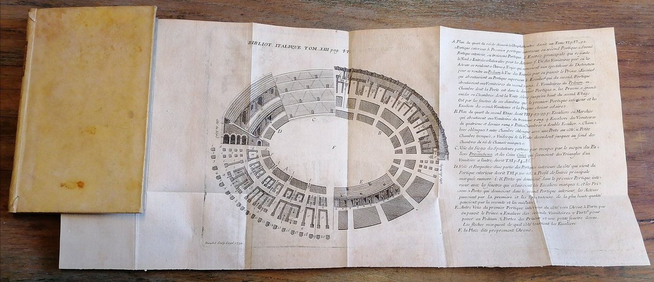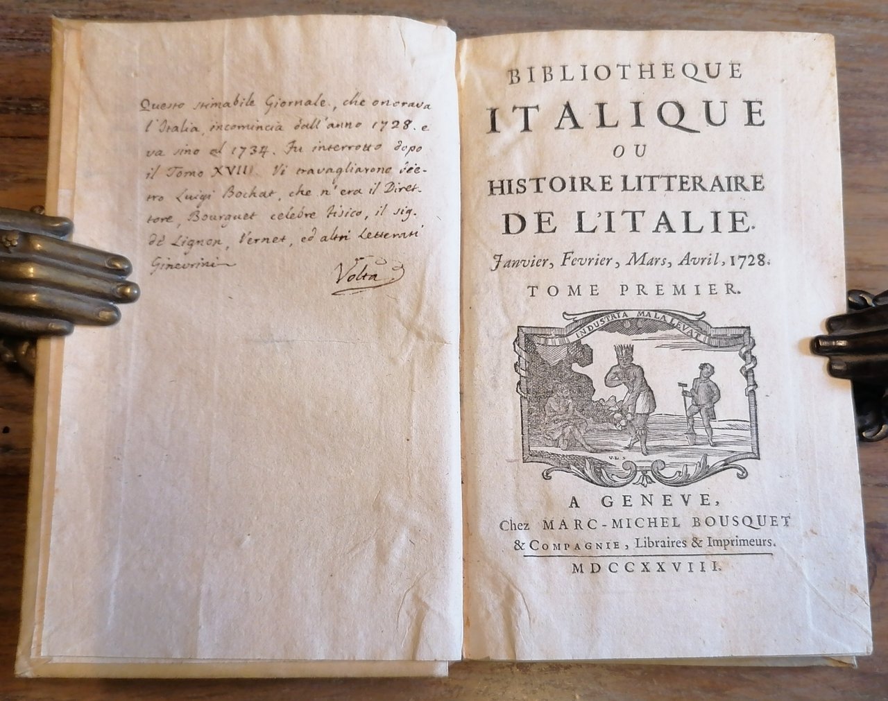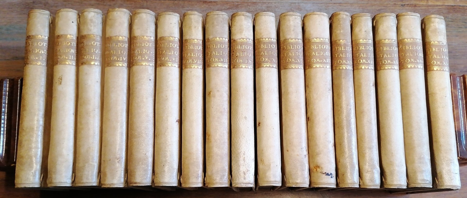 Diciassette volumi in 8° antico (cm 16 x 11), legatura coeva in piena pergamena , tassello con titoli in oro al dorso, tagli spruzzati. Edizione originale della rivista quadrimestrale dedicata alla cultura italiana pubblicata a Ginevra da Marc-Michel Bousquet dal 1728 al 1734, non è presente il diciottesimo ed ultimo tomo del 1734 che completa la raccolta. Vol. I : 1728, pp. XXIV,(2),300 con un ritratto inciso. Vol. II : 1728, pp. (6),335,(3). Vol. III : 1728, pp. (4),316, con una tavola incisa. Vol. IV : 1729, pp. (4),303,(3). Vol. V : 1729, pp. VII,(1),300. Vol. VI : 1729, pp. (4),300. Vol. VII : 1730, pp. (4),276. Vol. VIII : 1730, pp. (4),278,(2). Vol. IX : 1730, pp. (4),276. Vol. X : 1731, pp. (4),290. Vol. XI : 1731, pp. (4),292. Vol. XII : 1731, pp. (4),302. Vol. XIII : 1732, pp. (4),260, con una tavola incisa ripiegata. Vol. XIV : 1732, pp. (4),276. Vol. XV : 1732, pp. (4),300. Vol. XVI : 1733, pp. (4),316. Vol. XVII : 1733, pp. (4),300. Negli ultimi tre volumi è presente al frontespizio una diversa marca tipografica. Ex libris applicato al contropiatto anteriore in tutti i volumi. Nota manoscritta a firma Volta al contropiatto anteriore del volume primo. Ottimo stato di conservazione.