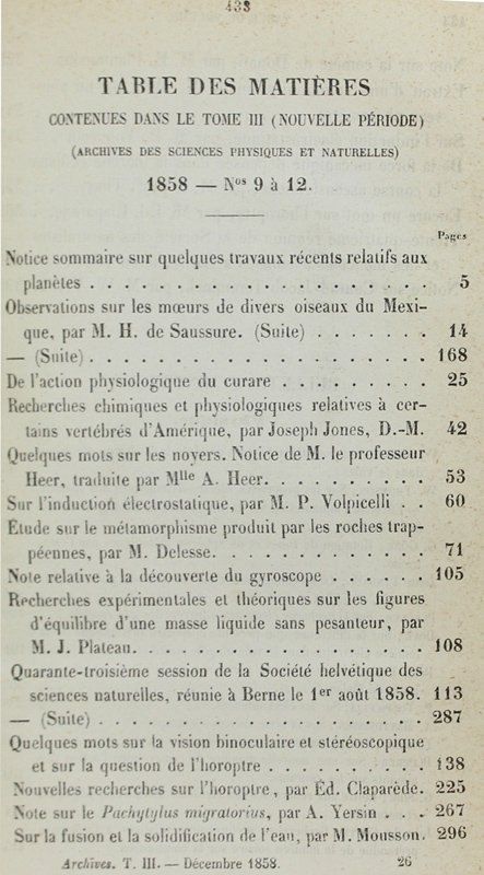 BIBLIOTHEQUE UNIVERSELLE - Revue Suisse et Etrangère. ARCHIVES DES SCIENCES PHYSIQUES ET NATURELLES. Nouvelle Période - Tome 3