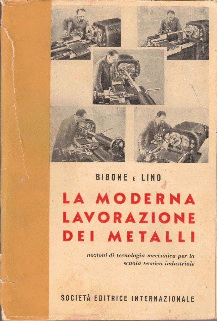 Bibone e Lino, La moderna lavorazione dei metalli. Nozioni di tecnologia meccanica per la scuola tecnica industriale, Società Editrice Internazionale, Torino 1956, seconda ed. ampliata e aggiornata, pp. 523, ill. b.n., 6 c. di tavv. f.t. ill. b.n., cm 22, br. ed. Tracce d’uso alla brossura, una piccola mancanza al dorso, per il resto minime fioriture, qualche sporadica traccia di lapis, ma nel complesso buona copia, ben tenuto l'interno.