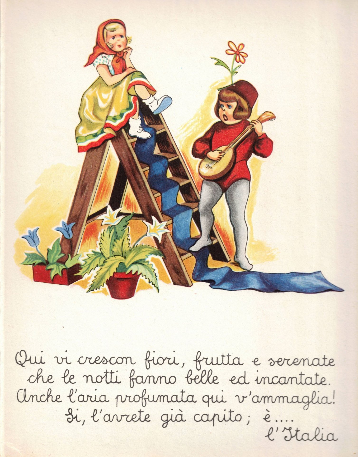 In-8 p., cartonato editoriale illustrato a colori (dorso rifatto in tela), risguardi illustrati a colori, 10 pp.nn. in cartoncino spesso che contengono la narrazione del viaggio dei due protagonisti, Bicetta e Francesco, corredata di bellissimi disegni a colori.Traduzione dal francese del racconto di Pierre Blanchard (1772-1856), "Bibiche et francois en voyage". Dove si va? C'è chi lo sa! Sfogliatevi con calma questo bel librone e troverete in esso la vera soluzione. Solo così viaggiando, sul treno fantasia' si va dove si vuole, tutto in economia.Ben conservato.