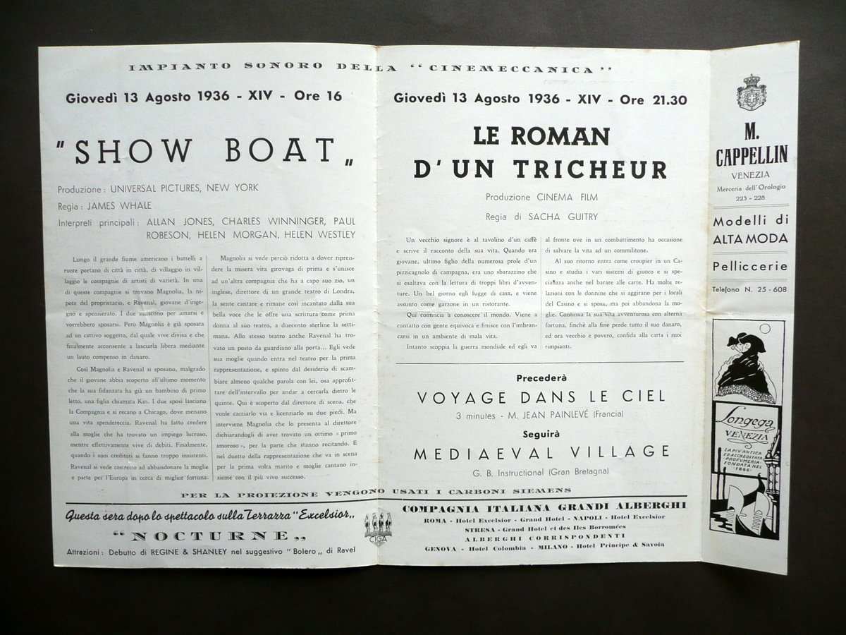 Programma, Biennale di Venezia IV Mostra Internazionale d'Arte Cinematografica 10 - 31 agosto 1936 programma giornaliero Ommassini & Pascon, Venezia 1936; programma pieghevole a stampa, con qualche inserzione pubblicitaria d'epoca in b/n; copertina con bella grafica d'epoca a colori. Cm 24x15,5. Condizioni di conservazione Esemplare ben conservato con tracce d'uso, lieve traccia di piega centrale di conservazione, poche pressoché trascurabili tracce di sporco. SC03.D13122 N