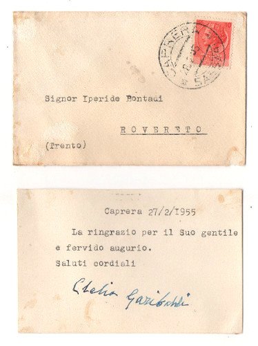 Bigliettino di ringraziamento formato mm 107x 69 con firma autografa di Clelia Garibaldi (1867-1959) figlia di Giuseppe Garibaldi completo di busta viaggiata.-- Ringraziamenti al sig. Iperide Bontadi di Rovereto.