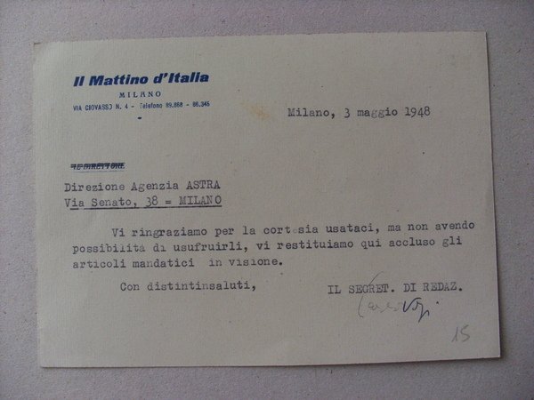 Biglietto - invio IL MATTINO D´ITALIA Milano. 1948