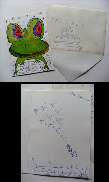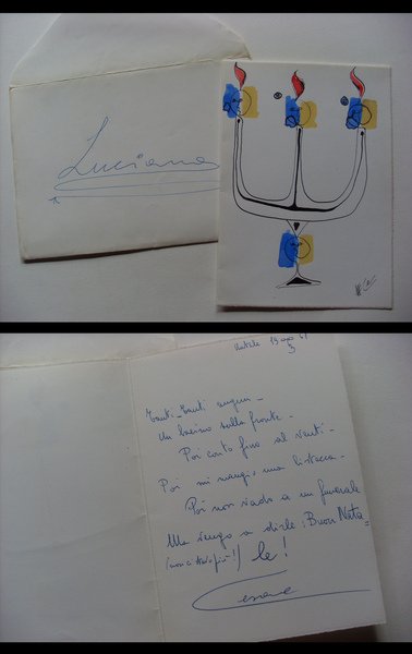 Biglietto augurale + busta disegnato e scritto da CESARE RIVA (scultore e pittore). anni´60. Pezzo Unico