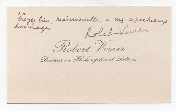 AUTOGRAFO Documento autografo originale. In ottime condizioni. Indirizzato ad una certa «Mademoiselle», a proposito di alcuni «bullettins». Vivier è stato un’importante filologo romanista, successore di Maeterlinck all’Académie royale de Langue et de Littérature françaises. La sua attività poetica, costante, è da inquadrare generalmente nella scia lunga del simbolismo francese, non senza tuttavia aperture al modernismo.