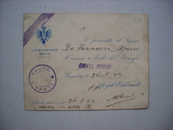 *Biglietto di trasporto Priroscafo CONTE ROSSO Lloyd Sabaudo GENOVA. 1922