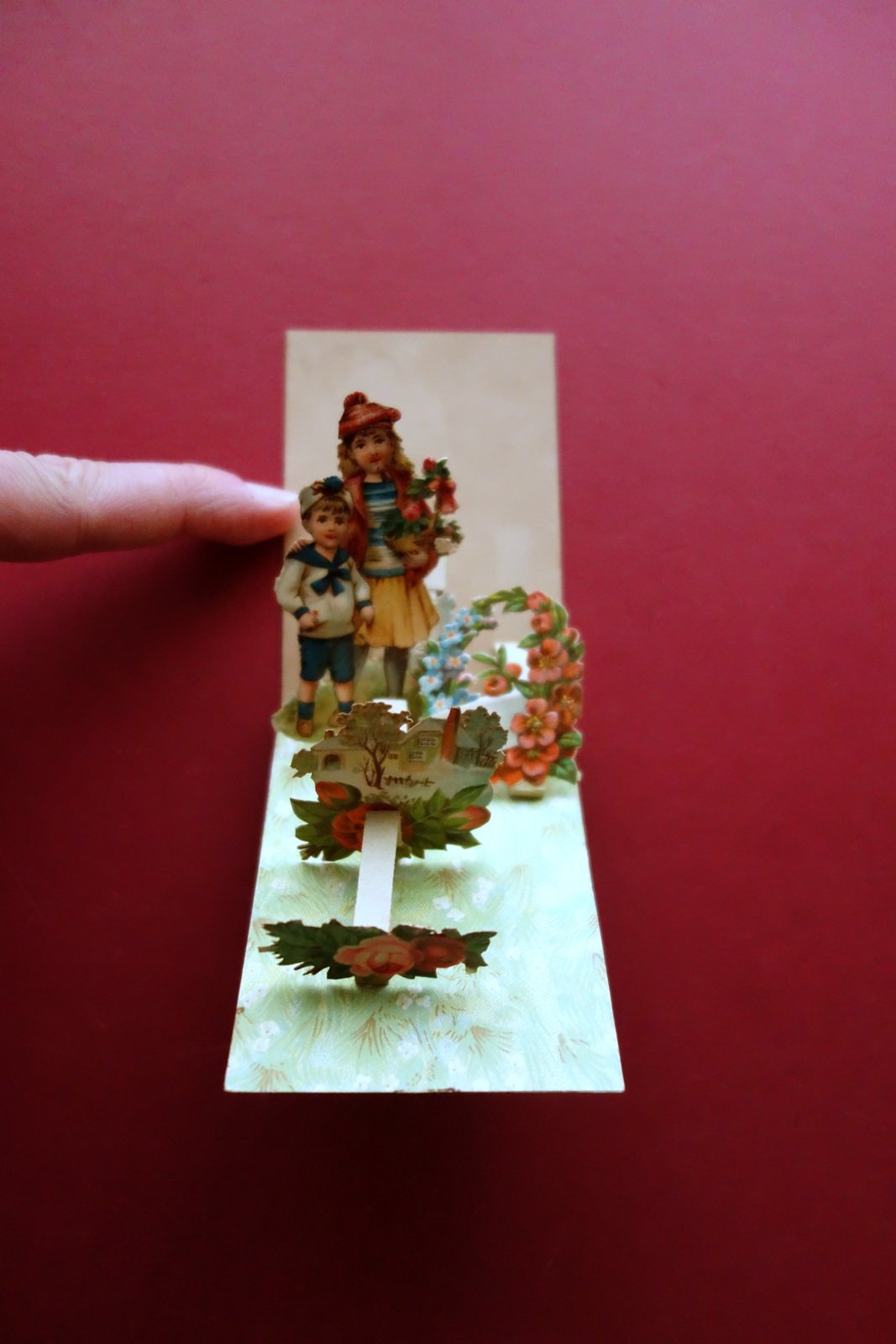 Senza dati tip., s. d. ma primo '900 circa; bel biglietto pop - up d'epoca, per auguri; bella grafica cromolitografica; al retro vecchia nota augurale d'epoca a penna (vedi foto). Dimensioni: cm 9x6.