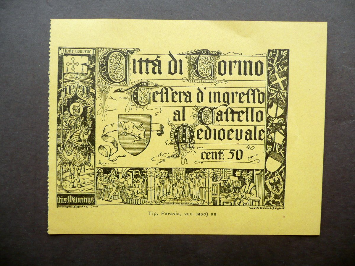 Biglietto d'ingresso, Città di Torino Tessera d'ingresso al Castello Medioevale Cent. 50 Tip. Paravia, s. d.; bel biglietto d'ingresso a stampa su carta gialla, con vari fregi in b/n. Cm 9,5x12. Condizioni di conservazione Esemplare ben conservato con leggere tracce d'uso, un margine tratteggiato per distacco singolo (mancante di matrice, vedi foto). SC03.D12515 N
