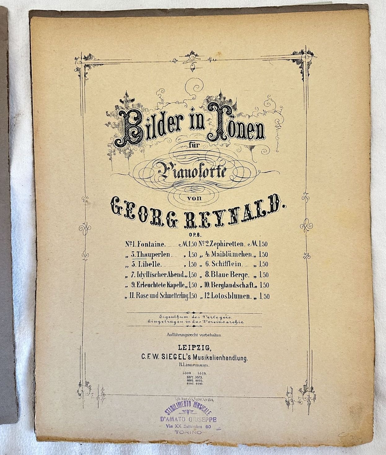 Edizione della fine dell'ottocento della melodia nr. 3 "Thaupeerlen" dall'opera n. 6 per pianoforte del compositore tedesco Georg Reynald In discrete condizioni. Copertina morbida coeva in buone condizioni con lievi usure marginali. Piatti staccati. Legatura in buone condizioni. Pagine in buone condizioni con fioriture. In folio. cm. 34,5x27. Pp. 7.Edition of late 19th century of the melody nr. 3 "Thaupeerlen" from the opera n. 6 by the german composer Georg Reynald. In fair conditions. Soft coeval cover in good conditions with lightly worn in the extremities. plates are detached. Plates are detached. Binding in good conditions. Pages in good conditions with foxing.In folio. cm. 34,5x27. Pp. 7.