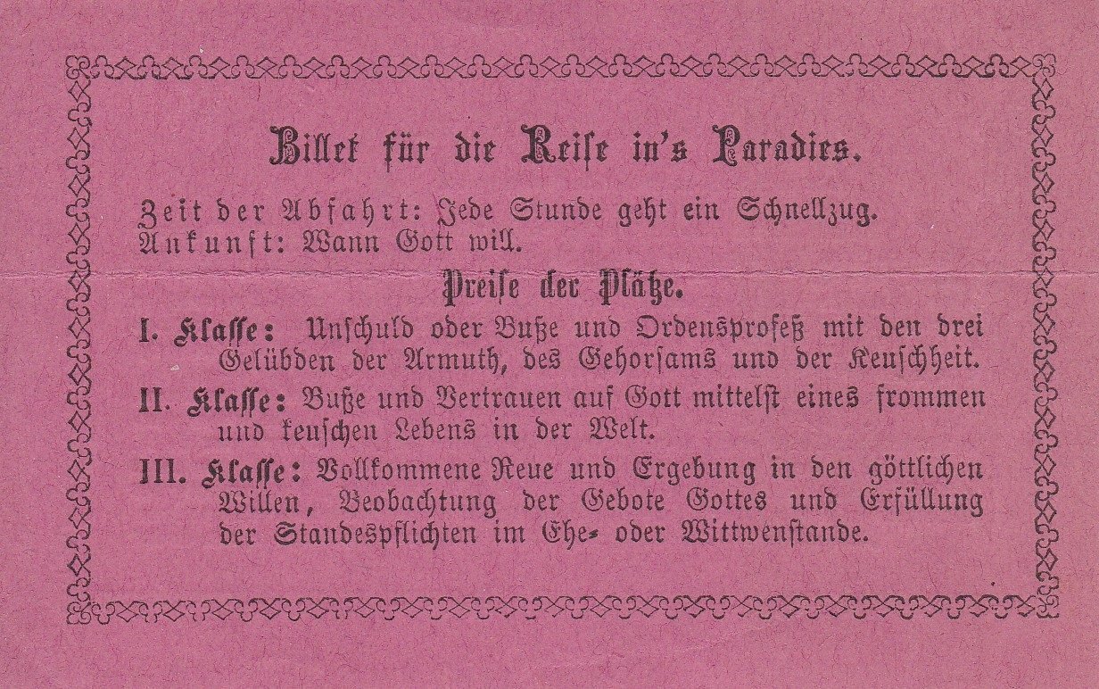 Das kleine Andachtskärtchen ist beidseitig bedruckt und setzt die Reise ins Paradies mit einer Zugreise gleich, für die der Mensch durch sein frommes Verhalten das richtige Billet erwerben muss. Für die 1. Klasse wird beispielsweise gefordert: "Unschuld oder Buße und Ordensprozeß mit den drei Gelübden der Armuth, des Gehorsams und der Keuschheit." Sehr interessante katholische Archivalie!