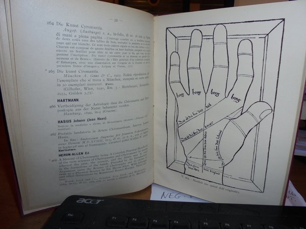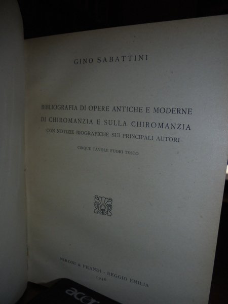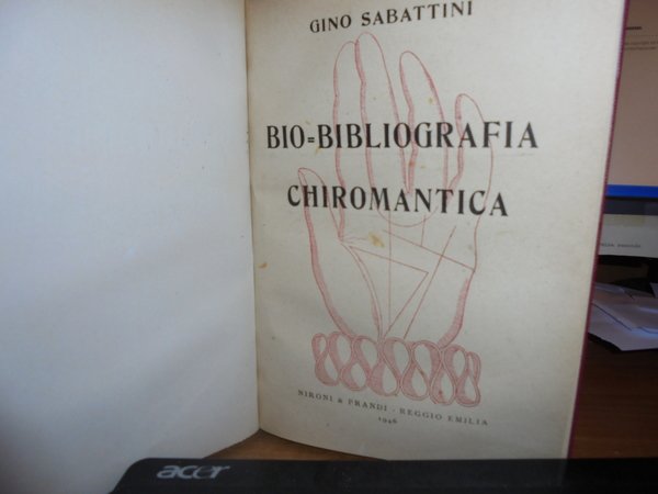 GINO, SABATTINI. Reggio Emilia, Nironi & Prandi, 1946. Bio=Bibliografia Chiromantica. In-16° grande, tela con titolo in oro al dorso, copertine originali conservate. 110 pp. con cinque tavole fuori testo. Ottimo esemplare il legatura recente. Edizione tirata in 200 copie. Neg. mob. bianco nuovo comput.
