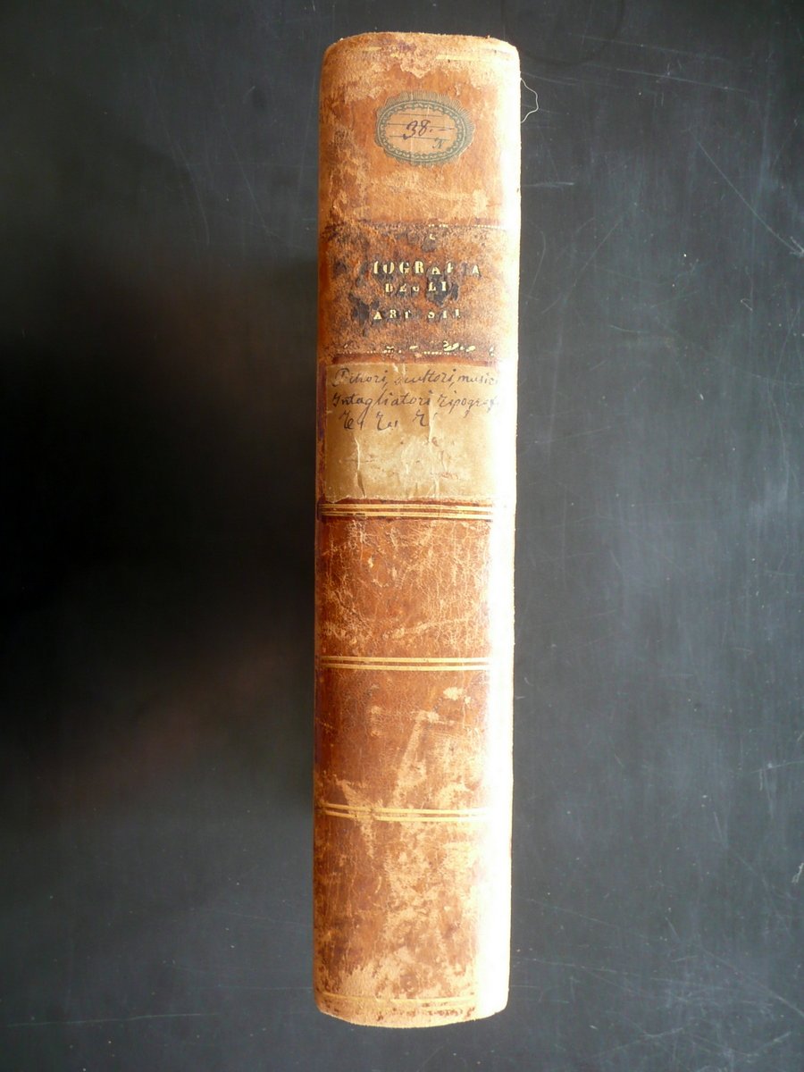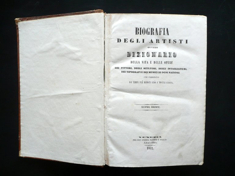 Biografia degli artisti ovvero Dizionario della vita e delle opere dei pittori, degli scultori, degli intagliatori, dei tipografi e dei musici di ogni nazione che fiorirono da' tempi pi√π remoti sino a' nostri giorni Seconda edizione Presso Andrea Santini e Figlio, Venezia 1852; cm 28,5x19; pp. 1110; mezza tela d'epoca con titolo e fregi in oro al dorso; ulteriore etichetta recante il titolo annotato a mano e vecchio pecetto per archiviazione privata. Condizioni di conservazione Esemplare ben conservato con tracce d'uso, coperta con alcune piccole abrasioni e mancanze; dorso con parziale perdita del titolo in oro. Interni buoni con alcune piccole leggere bruniture. SETT176.L15853 N