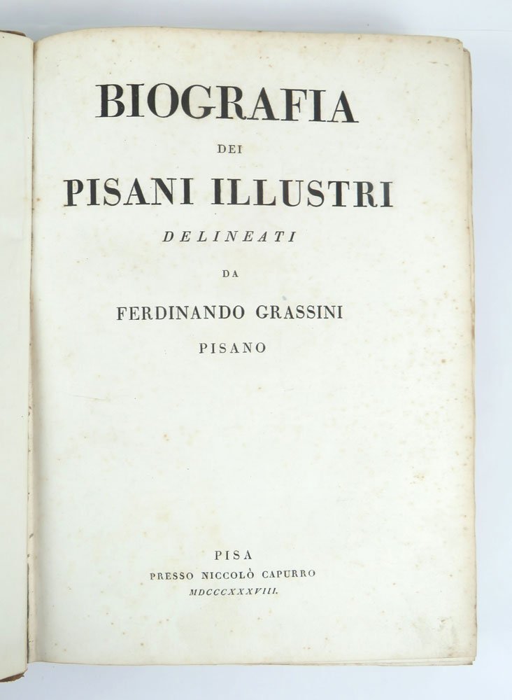 LIBROEdizione originale.Bell’esemplare in barbe.Approfondita raccolta di biografie (sono 83) che ripercorre la storia di Pisa attraverso i suoi più illustri personaggi: Domenico Cavalca, Bartolomeo da S. Concordio, Niccolò V, Galileo, Artemisia Gentileschi, e molti altri. Notevoli i ritratti che accompagnano ciascuna biografia.