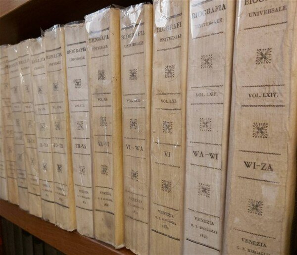 65 voll. in-8, brossura edit. con cornici xilogr. Testo su due colonne. Eccezionale opera nella rara traduzione italiana su quella francese ideata dai fratelli Michaud, con le biografie di migliaia di autori italiani e stranieri, comprendente anche la Biografia Mitologica (in 3 volumi) e i Supplementi. Bibliografia di riferimento superata solo dal Dizionario Biografico degi Italiani (Treccani) ma per la parte italiana. Perfetto esempl. con i volumi in legatura uniforme tutti nella veste editoriale originale, in barbe.