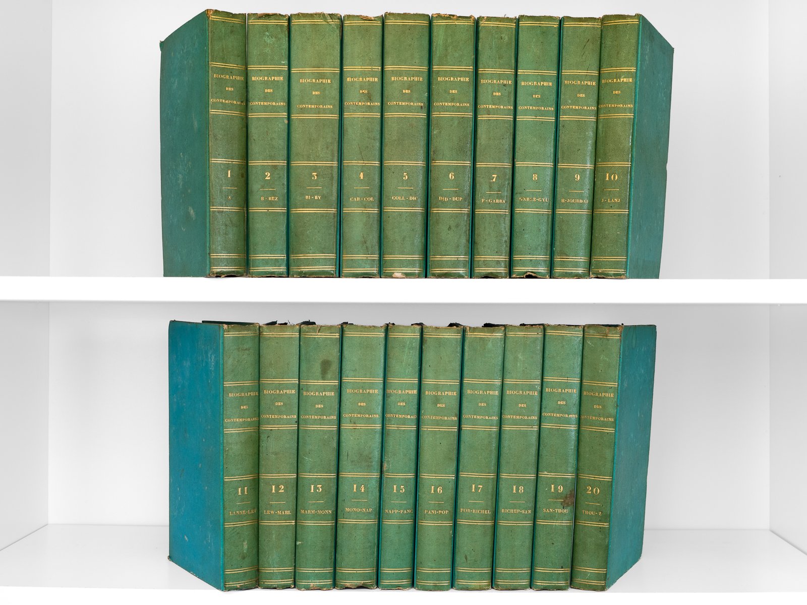 Ornée de 240 portraits au burin, d'après les plus célèbres artistes, 20 vol. in-8 cartonnage bradel d'époque bleu vert, A la Librairie Historique, Paris, 1820 - 1825, plus de 320 planches hors texte. Bon ensemble (couv. lég. frottée, bon état par ailleurs). Important ouvrage de référence sur l'histoire de la Révolution française, du Consulat, de l'Empire et de la Restauration. Rappel du titre complet : Biographie Nouvelle des Contemporains (20 Tomes - Complet) Ou Dictionnaire historique et raisonné de tous les Hommes qui, depuis la Révolution Française, ont acquis de la Célébrité par leurs actions, leurs écrits, leurs erreurs ou leurs crimes, soit en France, soit dans les pays étrangers.