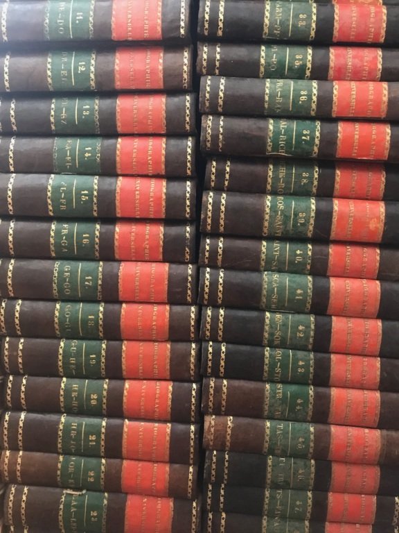 52 volumi in-8° (cm. 20), legature coeve in mezza pelle con titoli in oro su tasselli rossi e verdi ai dorsi (lievi segni d'usura, solo un dorso compromesso), tagli spruzzati; lievi fioriture sparse, antico Ex Libris impresso ai risguardi. Opera poderosa che impegnò l'editore fino alla morte, qui priva dei supplementi. «Sans être un livre parfait, cet important ouvrage était incontestablément, lorsq'il parut, le meilleur de ce genre qui existât; et l'on a remarqué avec plaisir que le derniers volumes étaient généralement rédigés avec plus de soins que les premiers» [Brunet I, 948]. Buon esemplare. [N9-N10-N11]