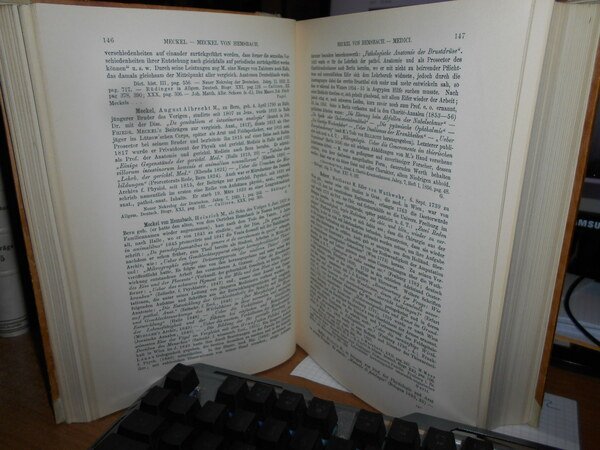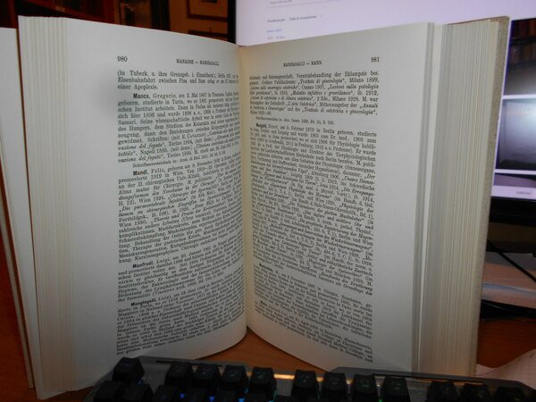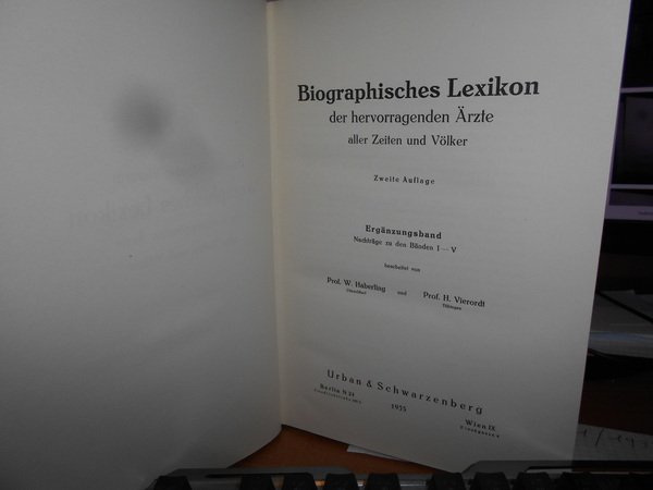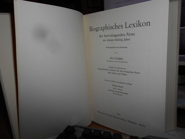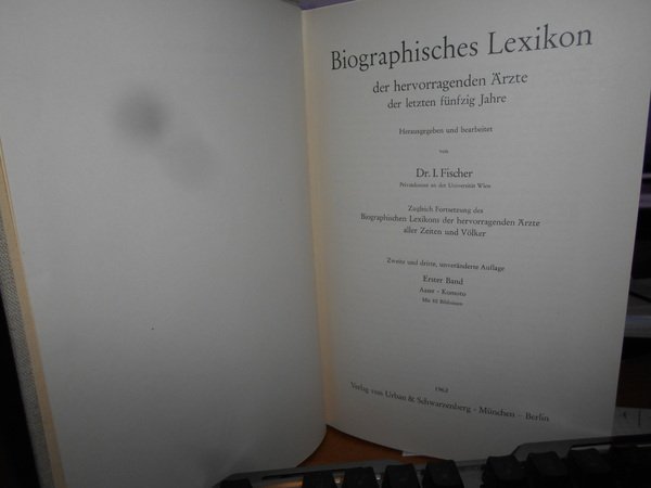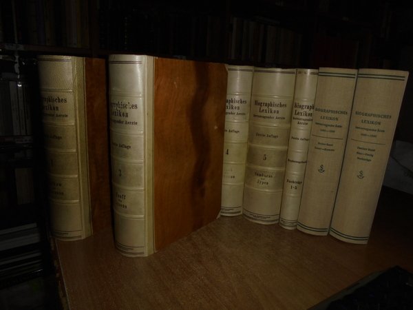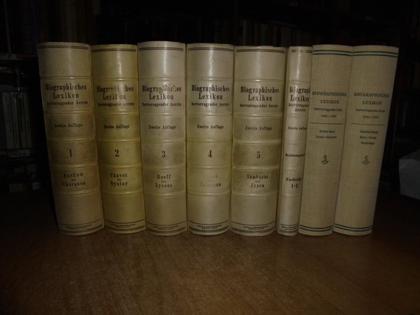 AUGUST HIRSCH. I. Fischer. Berlin, Urban & Schwarzenberg, 1929 - 1930 - 31 - 32 - 35 - 62. Biographisches Lexikon der hervorragenden Ärzte aller Zeiten und Völker. 8 volumi in-8°, 6 volumi in m. pelle coeva con angoli + 2 volumi in tela edit. XXXVIII, 898 pp.; (iii), 926 pp.; (iii), 873 pp.; (X), 964 pp.; (iii), 1058 pp.; 426 pp.; Erster Band 1880-1920. Zweiter Band. 1880-1930. per complessive 1741 pp. Ottimo esemplare (completo). Vendibile solo in Italia. Uff. D - III - 3