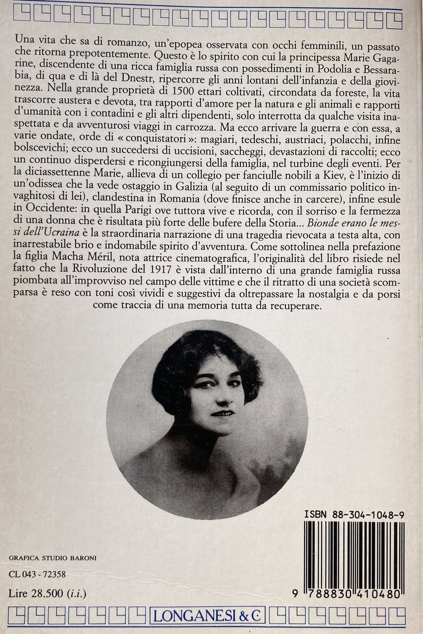 Una vita che sa di romanzo, un'epopea osservata con occhi femminili, un passato che ritorna prepotentemente. Questo è lo spirito con cui la principessa Marie Gagarine, discendente di una ricca famiglia russa con possedimenti in Podolia e Bessarabia, di qua e di là del Dnestr, ripercorre gli anni lontani dell'infanzia e della giovinezza. Nella grande proprietà di 1500 ettari coltivati, circondata da foreste, la vita trascorre austera e devota, tra rapporti d'amore per la natura e gli animali e rapporti d'umanità con i contadini e gli altri dipendenti, solo interrotta da qualche visita inaspettata e da avventurosi viaggi in carrozza. Ma ecco arrivare la guerra e con essa, a varie ondate, orde di conquistatori: magiari, tedeschi, austriaci, polacchi, infine bolscevichi; ecco un succedersi di uccisioni, saccheggi, devastazioni idi raccolti; ecco un continuo disperdersi e ricongiungersi della famiglia, nel turbine degli eventi. Per la diciassettenne Marie, allieva di un collegio per fanciulle nobili a Kiev, è l'inizio di un'odissea che la vede ostaggio in Galizia (al seguito di un commissario politico invaghitosi di lei), clandestina in Romania (dove finisce anche in carcere), infine esule in Occidente: in quella Parigi ove tuttora vive e ricorda, con il sorriso e la fermezza di una donna che è risultata più forte delle bufere della Storia. Bionde erano le messi dell'Ucraina è la straordinaria narrazione di una tragedia rievocata a testa alta, con inarrestabile brio e indomabile spirito d'avventura. Come sottolinea nella prefazione la figlia Macha Méril, nota attrice cinematografica, l'originalità del libro risiede nel fatto che la Rivoluzione del 1917 è vista dall'interno di una grande famiglia russa piombata all'improvviso nel campo delle vittime e che il ritratto di una società scomparsa è reso con toni così vividi e suggestivi da oltrepassare la nostalgia e da porsi come traccia di una memoria tutta da recuperare.