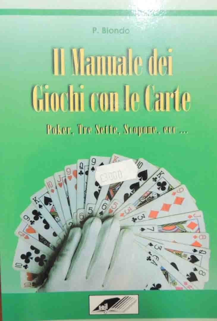 P. Biondo, Il manuale dei giochi con le carte. Poker, tre sette, scopone ecc., Zeus Editoriale, s.l. (ma stampato a Cerbara – Città di Castello (Perugia), presso la A. C. Grafiche srl) 1996, pp. 124, ill. b.n., cm 21, br. ed. Uniforme brunitura della carta, per il resto perfetto.