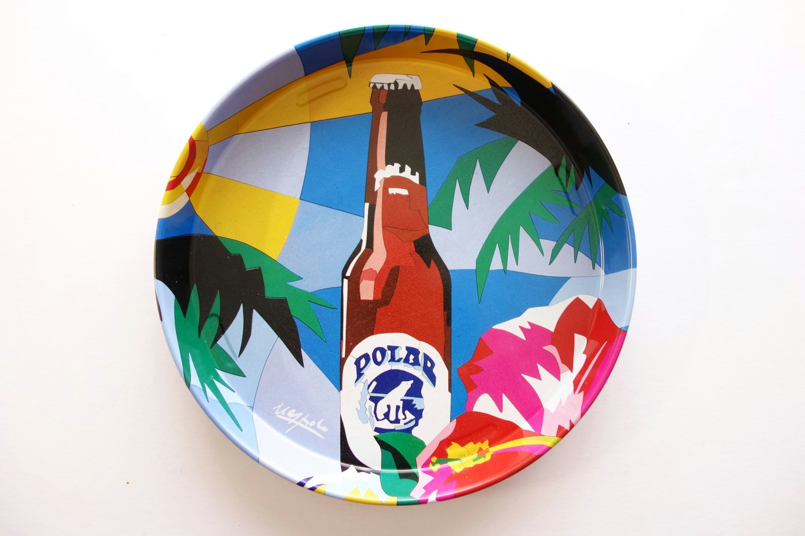 Vassoio pubblicitario metallico, Birra Polar - vassoio pubblicitario in metallo con bella grafica a colori realizzata (e firmata) da Ugo Nespolo art beer tray 1991 S. d. ma 1991; vassoio pubblicitario metallico, circolare, con bella grafica a colori firmata Ugo Nespolo; fondo con trattamento antiscivolo. Diametro cm 32,5. Condizioni di conservazione Esemplare molto ben conservato con qualche minimo segno di utilizzo. SC05.L0016 N
