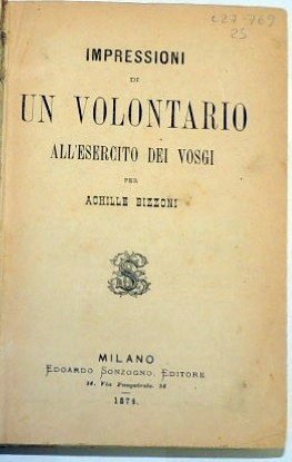Achille Bizzoni, Impressoni di un volontario all'esercito dei Vosgi, Edoardo Sonzogno Editore, Milano 1874, pp. 349. Rilegato con Alberto Mario, Camicia rossa. Episodi, P. Candi, La pubblicità. Racconto, Edoardo Sonzogno, Milano 1875, terza ed. riveduta e corretta, pp. 303, cm 18, mezza tela con titoli in oro al dorso. Evidenti tracce d'uso, legatura lievemente allentata, leggere scritte a lapis all'interno del piatto anteriore.