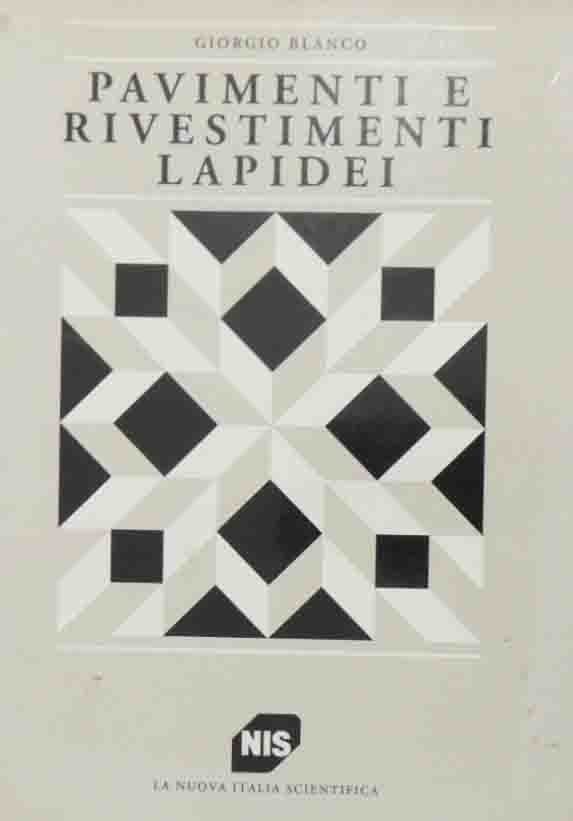 Giorgio Blanco, Pavimenti e rivestimenti lapidei. Selezione, posa in opera e restauro delle pietre ornamentali, La Nuova Italia Scientifica, Roma 1991, prima ed., pp. 295, ill. b.n. e col., cm 24, br. ed. con sovraccoperta. Collana Manuali del progettista, n. 22. Minime tracce d’uso alla sovraccoperta, lievissima ingiallitura della carta, per il resto ben conservato.