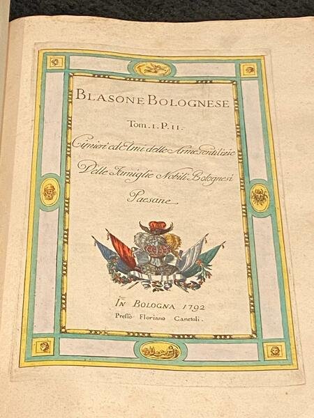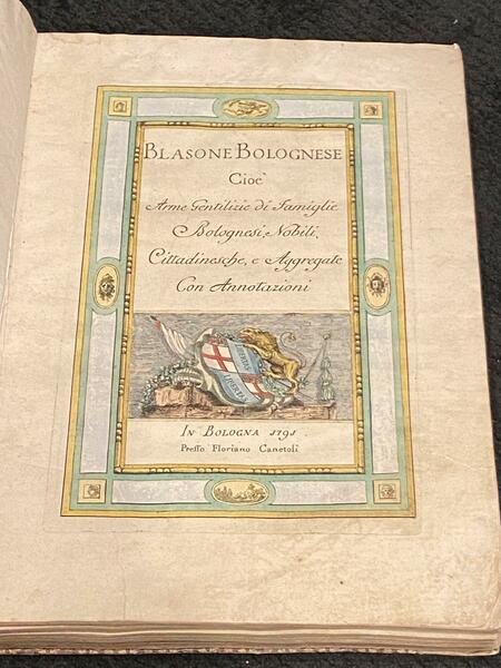 BLASONE BOLOGNESE. Cioè Arme Gentilizie di Famiglie Bolognesi Nobili, Cittadinesche, e Aggregate. Con annotazioni. Segue: Supplemento alle Arme delle Famiglie Nobili. Segue: Cimieri ed Elmi delle Arme gentilizie delle Famiglie Nobili Bolognesi Paesane. Segue: Arme Gentilizie delle Famiglie Nobili Forestiere aggregate alla nobiltà di Bologna.