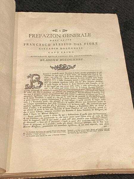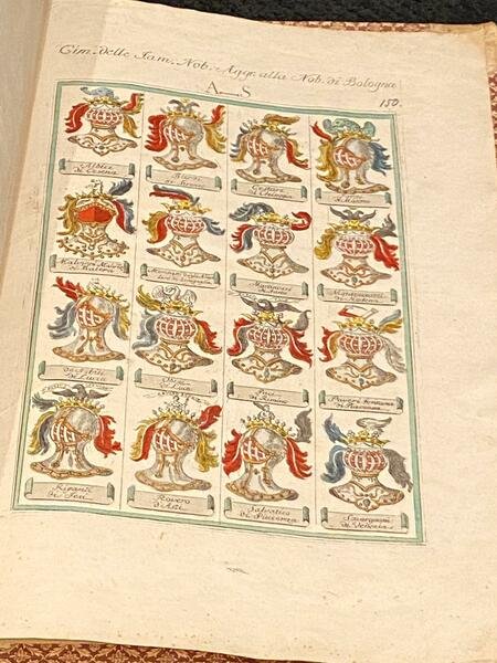 Un vol. in folio (cm. 50,0) Mz. perg. e punta coeva con tit. oro su tassello al dorso. Tomo I: frontespizio + una carta con dedica dell'editore al Nobilissimo Signore il Sig. Francesco Ghisileri Calderini + pp. 44 + 1 carta con grande blasone della famiglia Ghisilieri a piena pagina + 67 carte numerate, ciascuna con 16 blasoni impresse solo al recto + 10 carte numerate ciascuna con 16 blasoni impresse solo al recto costituenti il Supplemento. Tomo I Parte II: frontespizio + 67 carte numerate ciascuna con 16 incisioni impresse solo al recto. Tomo II: frontespizio + 1 carta con dedica dell'editore al chiarissimo ed ornatissimo Sig. Gioseffo Remondini + 1 carta con grande blasone inc. a piena pagina + 6 carte ciascuna con 16 incisioni impresse solo al recto. Strappetto riparato al margine bianco del primo frontespizio; macchiette rossastre al bordo estrerno di poche carte, altrimenti bell'esemplare fresco e nitido a grandi margini. Tutte le immagini sono incise in rame e colorate d'epoca all'acquerello. Mancano i Tomi III, IV e V. Per la collazione confrontare Olschki, Choix, 727 che commenta :"Ouvrage magnifique et d'une rareté extreme".
